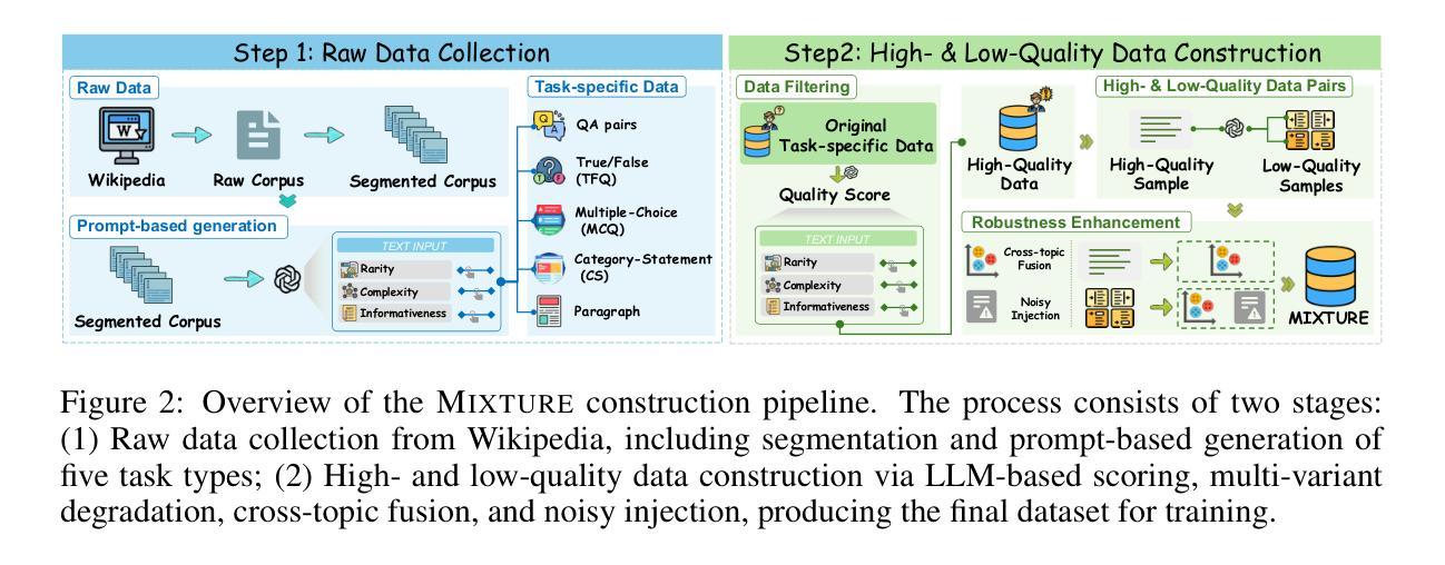 - MIXTURE数据集是通过一个综合数据构建管道创建的,包含低质量或语义冗余的指令集群与其高质量蒸馏配对。