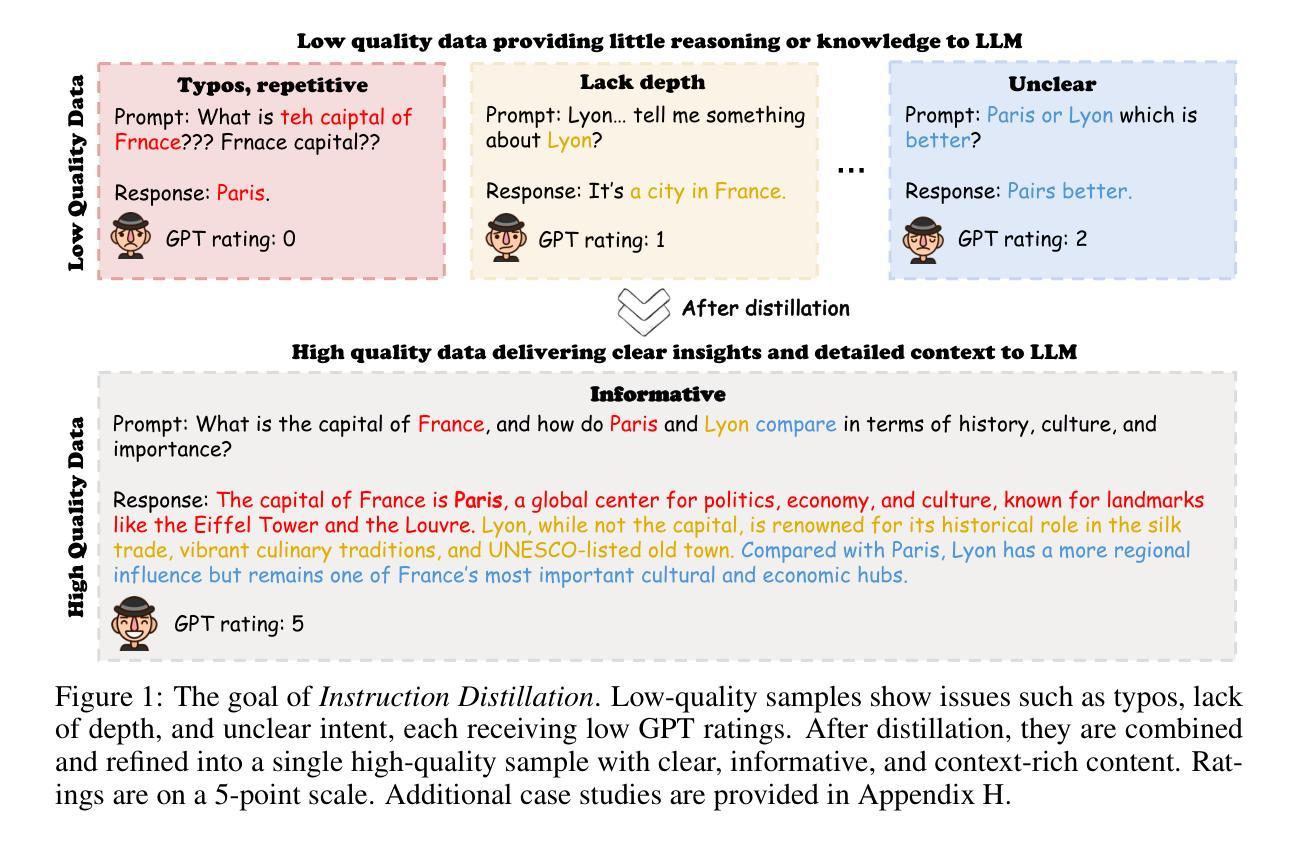- 指令蒸馏是将低质量和冗余的指令输入转化为高质量和连贯的指令输出的过程。
