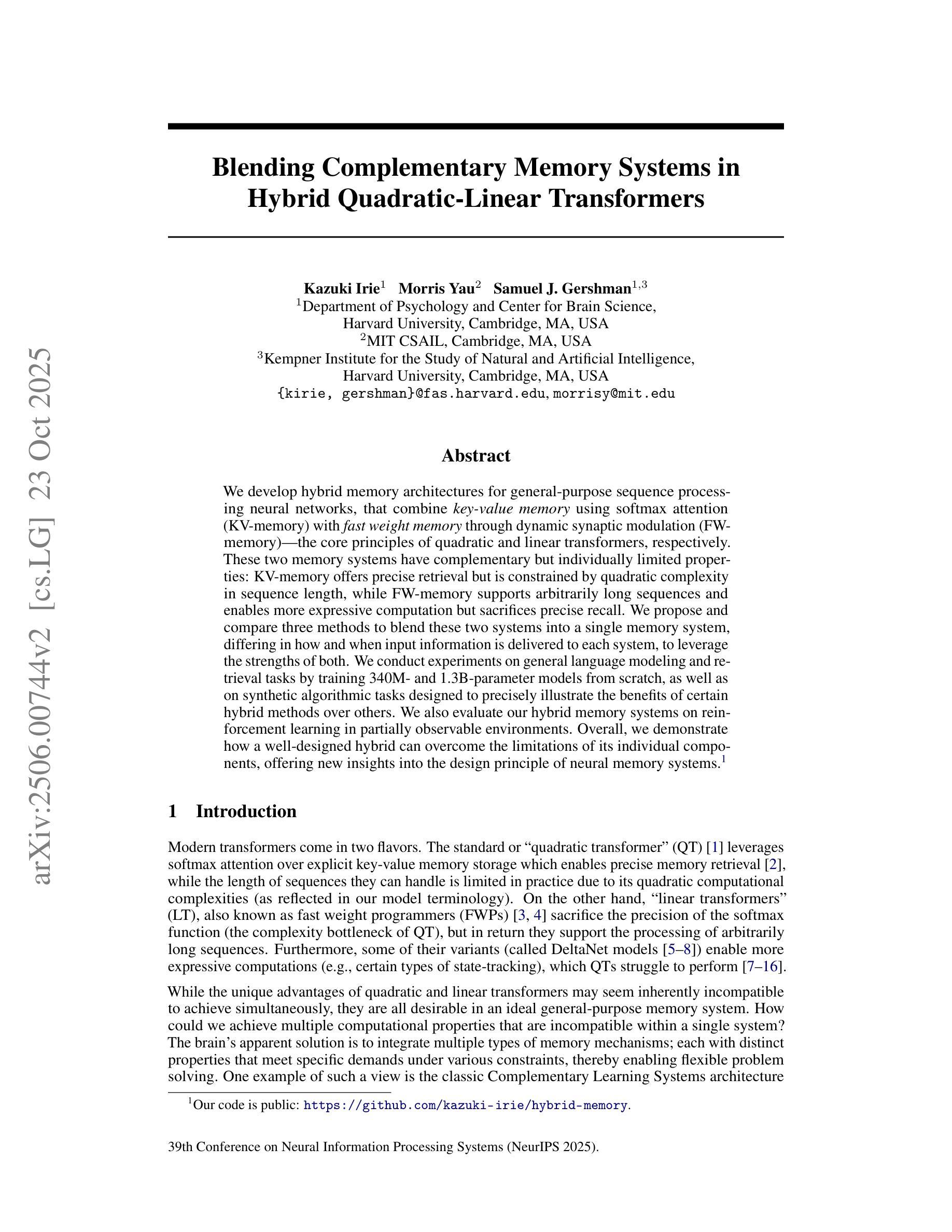 本文研究了混合记忆架构在通用序列处理神经网络中的应用,结合了基于softmax注意力的键值记忆(KV-memory)和通过动态突触调制实现的快速权重记忆(FW-memory),分别对应二次和线性变压器的核心原理。这两种记忆系统具有互补但个体局限的性质:KV-记忆提供精确检索,但受限于序列长度的二次复杂性;FW-记忆支持任意长度的序列并可实现更丰富的计算,但牺牲了精确回忆。本文提出了三种融合这两种系统的方法,在何时以及如何向各系统提供输入信息方面存在差异,以利用两者的优势。通过实验验证了混合记忆系统在一般语言建模和检索任务以及合成算法任务上的表现,并与强化学习在部分可观察环境中的表现进行了评估。研究表明,良好的混合设计可以克服单个组件的限制,为神经网络记忆系统的设计原则提供了新的见解。