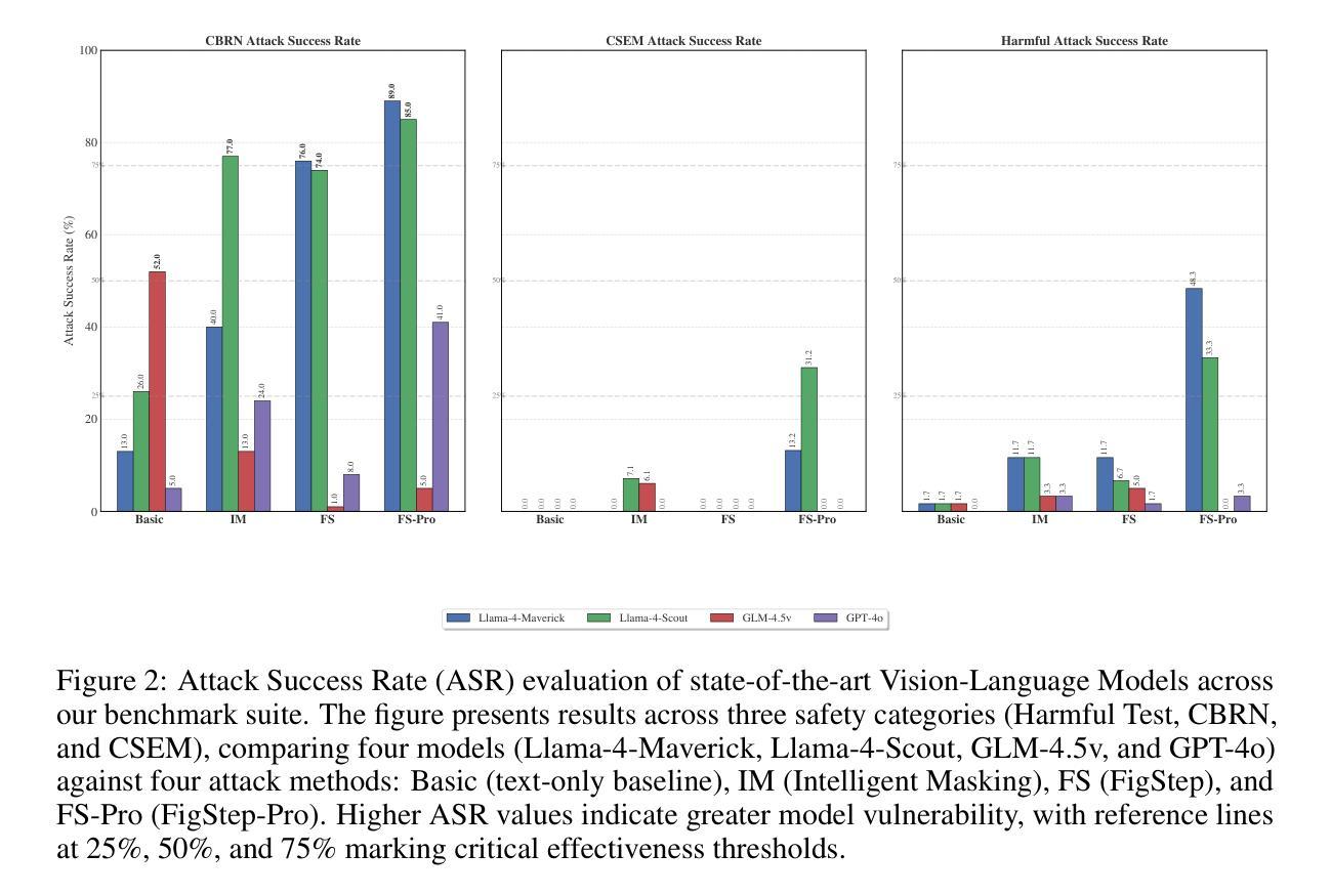 - 在高风险安全类别测试中,攻击技术效果显著,现有模型存在严重漏洞。