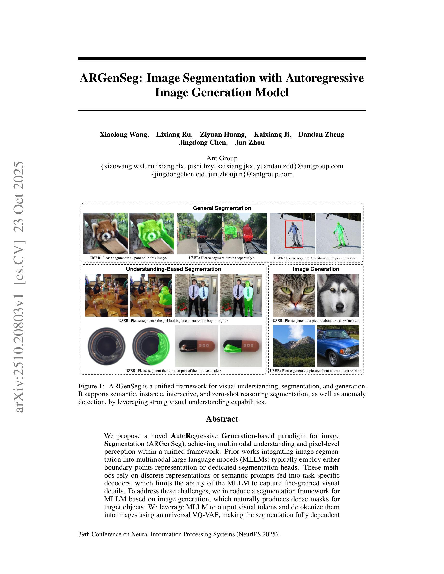 本文提出一种基于AutoRegressive Generation的新型图像分割范式(ARGenSeg),在一个统一框架内实现了多模态理解和像素级感知。与传统的将图像分割集成到多模态大型语言模型(MLLM)的方法相比,ARGenSeg采用基于图像生成的分割框架,自然地产生目标对象的密集掩膜。利用MLLM输出视觉符号,再通过通用VQ-VAE解码成图像,使分割完全依赖于MLLM的像素级理解。为提高推理速度,采用下一尺度预测策略并行生成所需视觉符号。实验表明,该方法在多分割数据集上的表现优于现有先进技术,并显著提高推理速度,同时保持强大的理解能力。