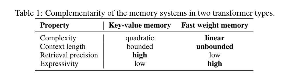 - 两种记忆系统具有互补性质:键值记忆提供精确检索,但受限于二次复杂性;快速权重记忆支持任意长度序列,但可能牺牲精确回忆。