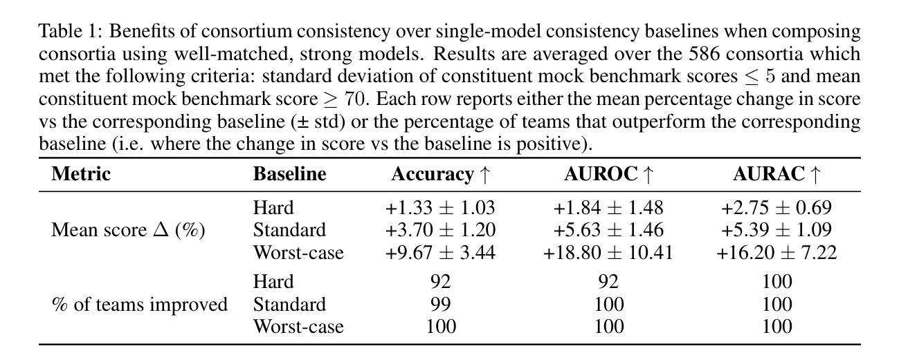 大型语言模型(LLM)的幻觉检测与缓解领域,最新工作展示了基于一致性方法的先进结果。此方法通过对单一LLM的多个响应进行聚合,来应对模型训练数据的不完美问题,包括偏见和部署时所需信息的不足等。通过将单个模型的一致性方法扩展到结合多个具有不同训练数据、训练方案和模型架构的LLM响应,能够在幻觉检测与缓解能力上实现进一步的显著提高。我们评估了“联盟一致性”方法,并在包含15个LLM的多个模型团队中进行了探索,了解在何种情况下以这种方式联合不同的LLM会更有益。此外,我们发现与单一模型一致性方法相比,这些性能改进往往伴随着推理成本的降低。