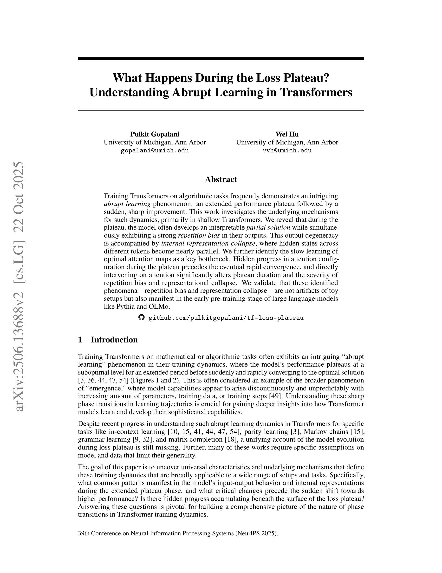 训练Transformer进行算法任务时,会出现一种有趣的现象:先是一段长时间的性能稳定期,然后突然有一个明显的提升阶段。本文探究了这种现象在浅层Transformer中的内在机制。我们发现,在稳定期,模型通常会出现一种可解释的局部解决方案,同时输出表现出强烈的重复倾向。这种输出退化伴随着内部表示的崩溃,不同标记的隐藏状态变得几乎平行。我们认为学习最优注意力地图的缓慢进展是一个关键的瓶颈。注意力配置过程中的隐蔽进步最终导致了快速的收敛过程,并且直接影响模型的表现。直接干预注意力机制会显著改变稳定期的持续时间以及重复倾向和代表性崩溃的严重性。我们验证了这些现象(重复偏见和代表性崩溃)不仅存在于玩具场景中,还存在于大型语言模型(如Pythia和OLMo)的早期预训练阶段。