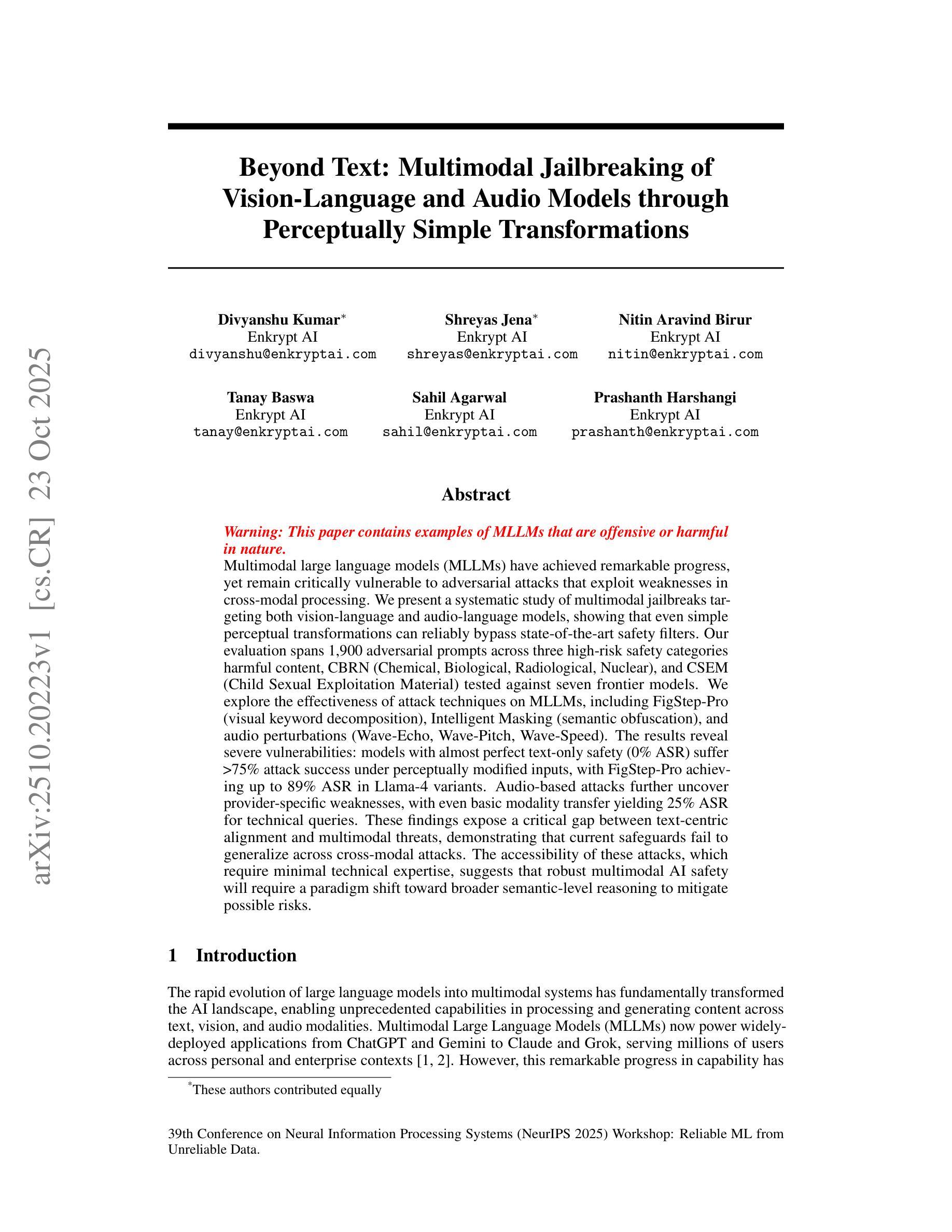 多模态大型语言模型(MLLMs)取得了显著的进步,但仍然面临着利用跨模态处理弱点发起对抗性攻击的严重威胁。我们对针对视觉语言模型和音频语言模型的多模态越狱进行了系统研究,发现即使简单的感知转换也能可靠绕过最新安全过滤器。我们的评估涵盖了针对三大高风险安全类别(有害内容、CBRN(化学、生物、辐射、核)和CSEM(儿童性剥削材料))的1900个对抗性提示,并对七款前沿模型进行了测试。我们探讨了攻击技术在MLLMs上的有效性,包括FigStep-Pro(视觉关键词分解)、智能掩码(语义模糊)和音频扰动(波回声、波音高、波速度)。结果揭示了严重的漏洞:几乎完美的纯文本安全模型(攻击成功率为0%)在感知修改后的输入下遭受超过75%的攻击成功,其中FigStep-Pro在Llama-4变种中达到高达89%的攻击成功率。基于音频的攻击进一步揭示了特定供应商的弱点,甚至基本的模态转换也会产生25%的攻击成功率(针对技术查询)。这些发现暴露了以文本为中心的对策和多模态威胁之间的关键差距,证明了当前的安全措施无法在跨模态攻击中推广。这些攻击易于实施,几乎不需要专业技术知识,因此稳健的多模态人工智能安全将需要转向更广泛语义层面推理的新范式,以减轻潜在风险。