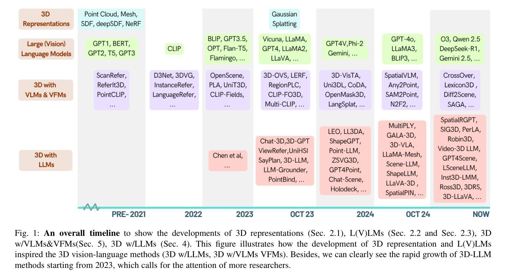 - 多种三维数据表示形式(如点云和NeRFs)与LLMs的融合方法被探讨。