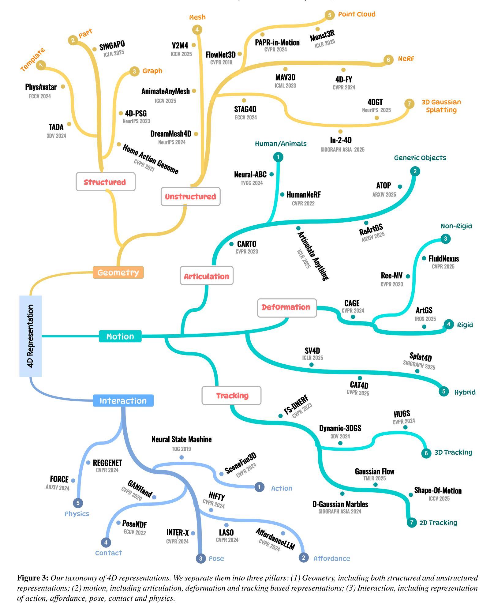 - 文章不仅关注当前流行的表示方法(如神经辐射场和三维高斯溅射),还探讨相对较少的四维环境下的表示方法(如结构化模型和长距离动作)。