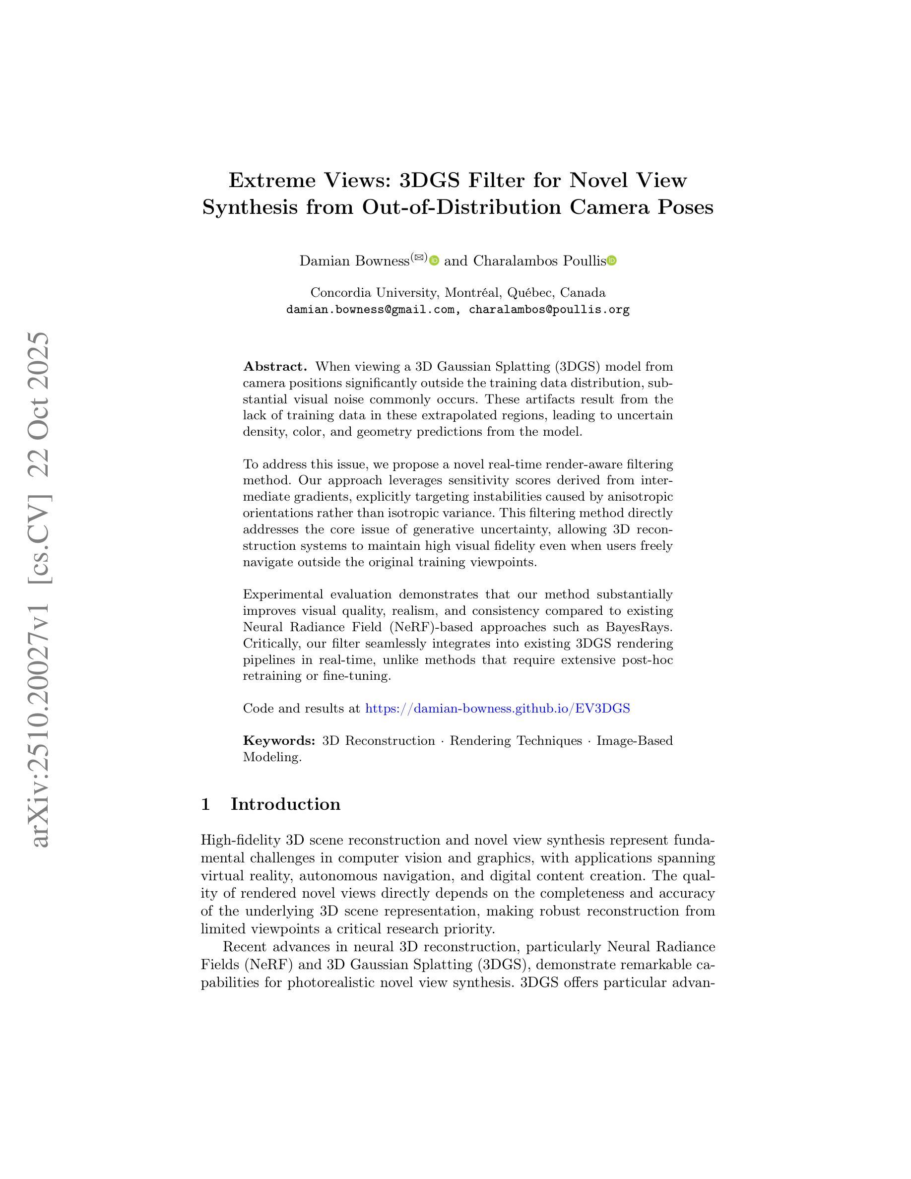 当从训练数据分布之外的相机位置观察3D高斯平铺(3DGS)模型时,通常会出现大量的视觉噪声。这些伪影是由于在这些外推区域缺乏训练数据,导致模型的密度、颜色和几何预测不确定。为了解决这一问题,我们提出了一种新的实时渲染感知滤波方法。我们的方法利用从中间梯度派生的灵敏度得分,明确针对由非各向同性方向引起的非稳定性,而不是各向同性方差。这种滤波方法直接解决了生成不确定性的核心问题,使得3D重建系统即使在用户自由导航原始训练视点之外时,也能保持高视觉保真度。实验评估表明,与现有的基于神经辐射场(NeRF)的方法(如BayesRays)相比,我们的方法在视觉质量、真实感和一致性方面有了显著改进。关键的是,我们的过滤器可以无缝地实时集成到现有的3DGS渲染流程中,不同于那些需要大量事后再训练或微调的方法。相关代码和结果请访问:https://damian-bowness.github.io/EV3DGS 。