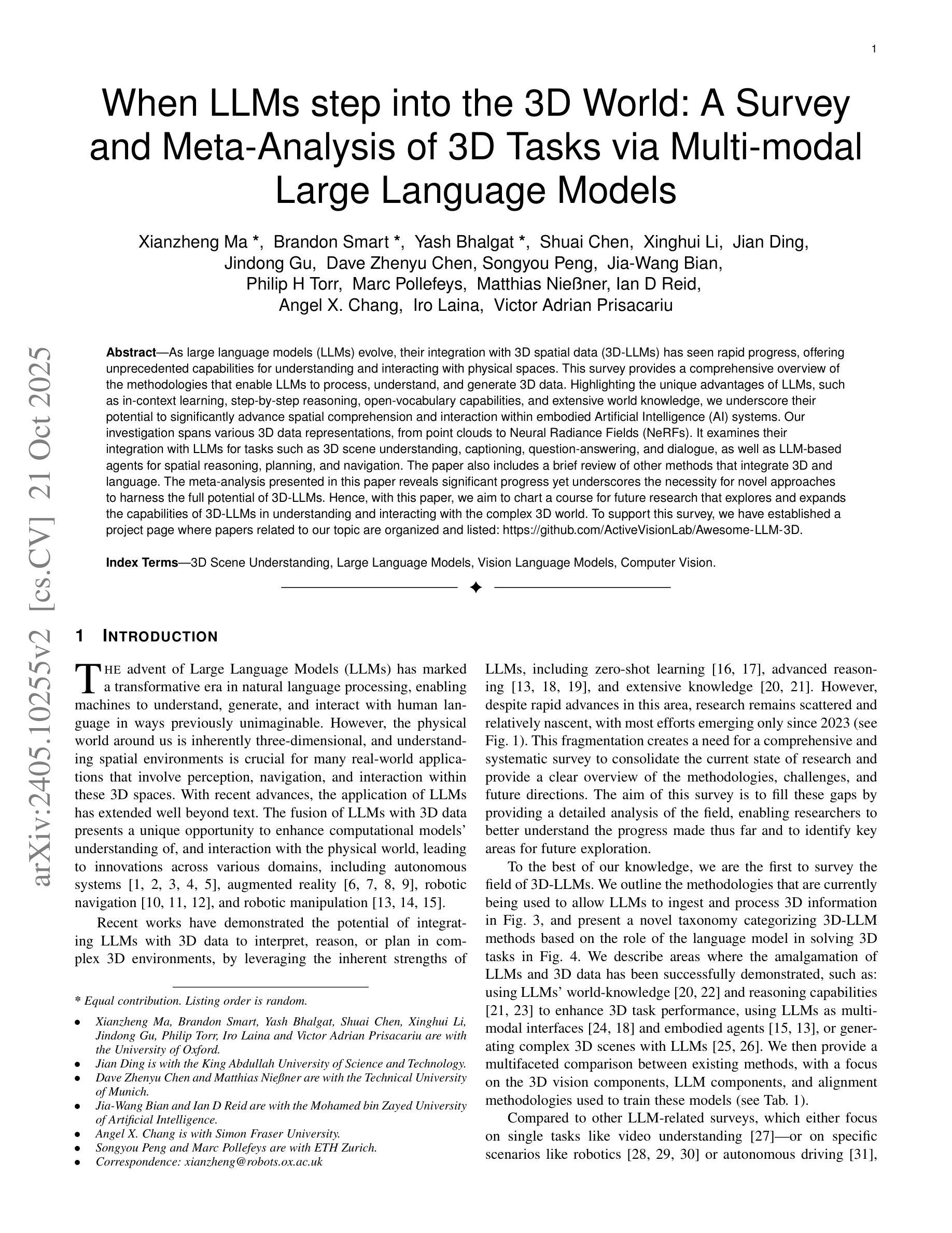 - 大型语言模型(LLMs)与三维空间数据(3D-LLMs)的融合取得快速进展。