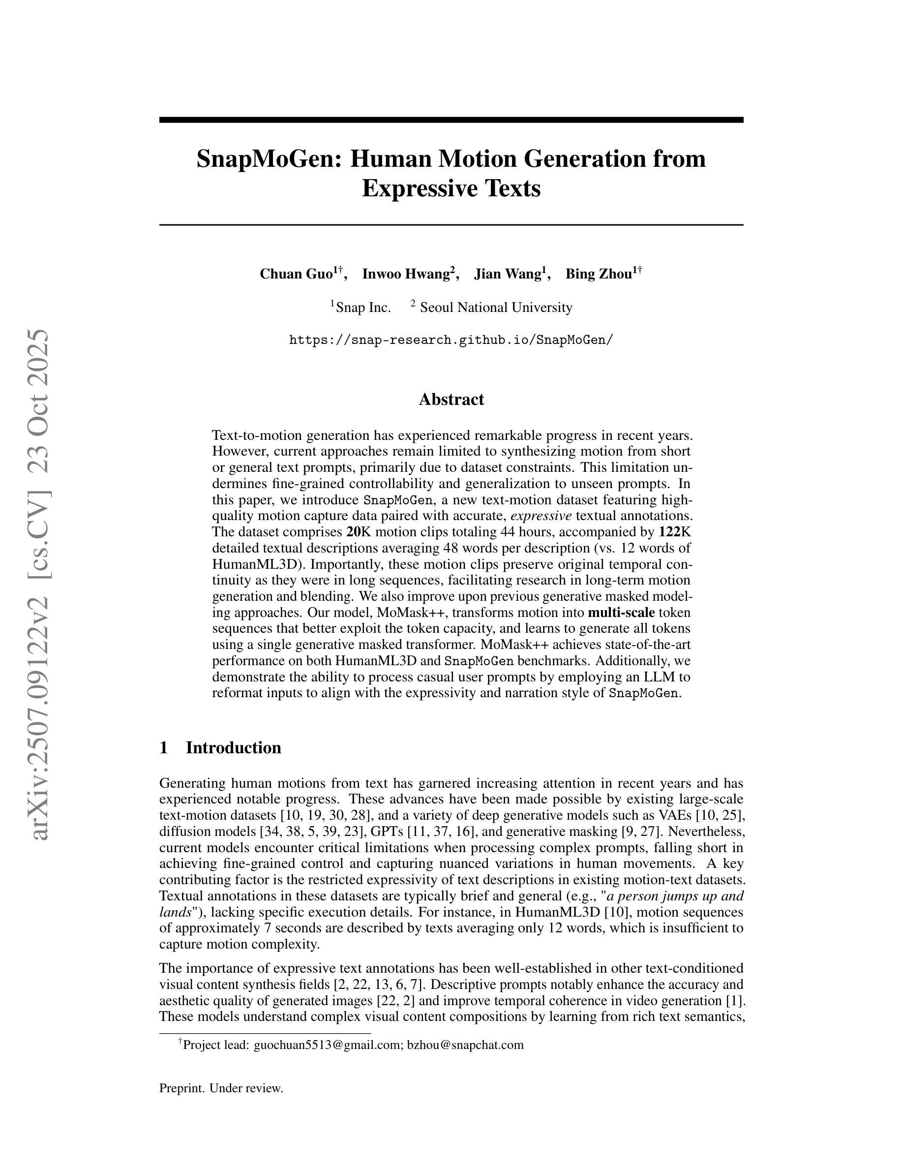 文本到动作生成技术在近年来取得了显著的进步。然而,当前的方法仍然局限于从短或通用文本提示中合成动作,这主要是因为数据集的限制。这一局限影响了对未见提示的精细控制和泛化。在本文中,我们介绍了SnapMoGen,一个全新的文本到动作数据集,它拥有高质量的动作捕捉数据与精确、生动的文本注释相配对。该数据集包含总计44小时的2万条动作片段,以及平均每条描述包含48个词的12万条详细描述(相比之下HumanML3D只有12个词)。重要的是,这些动作片段保持了原始的时间连续性,因为它们来自长序列,有助于长期动作生成和混合的研究。我们还改进了之前的生成式掩模建模方法。我们的模型MoMask++将动作转换为多尺度令牌序列,更好地利用令牌容量,并学习使用单个生成式掩码变压器生成所有令牌。MoMask++在HumanML3D和SnapMoGen基准测试中均达到了最先进的性能。此外,我们展示了通过使用大型语言模型处理随意用户提示的能力,以调整输入与SnapMoGen的表达能力和叙述风格相匹配。项目网页:https://snap-research.github.io/SnapMoGen/