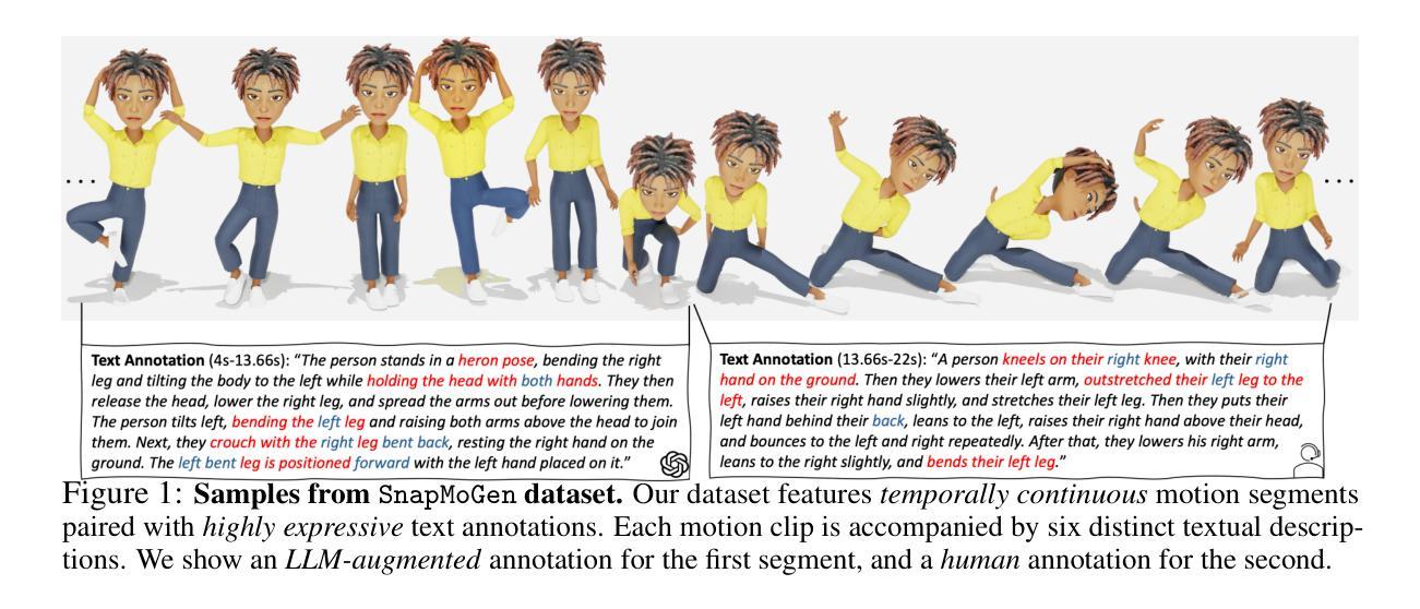 本文介绍了SnapMoGen数据集,该数据集包含高质量的运动捕捉数据与精确、生动的文本注解相配对。数据集包含20K运动片段,总时长为44小时,附带详细的文本描述,平均每个描述包含约四十八个字词。本文提出的新模型MoMask++能够将动作转化为多尺度标记序列,更充分地利用标记容量并生成所有标记序列。此外,该模型还能处理用户即兴提示,通过大型语言模型对输入进行重塑以适应SnapMoGen的数据特性。总体来说,这一工作实现了高质量的长序列动作捕捉数据与先进模型应用的深度融合。有关详情,请参见项目网页。
