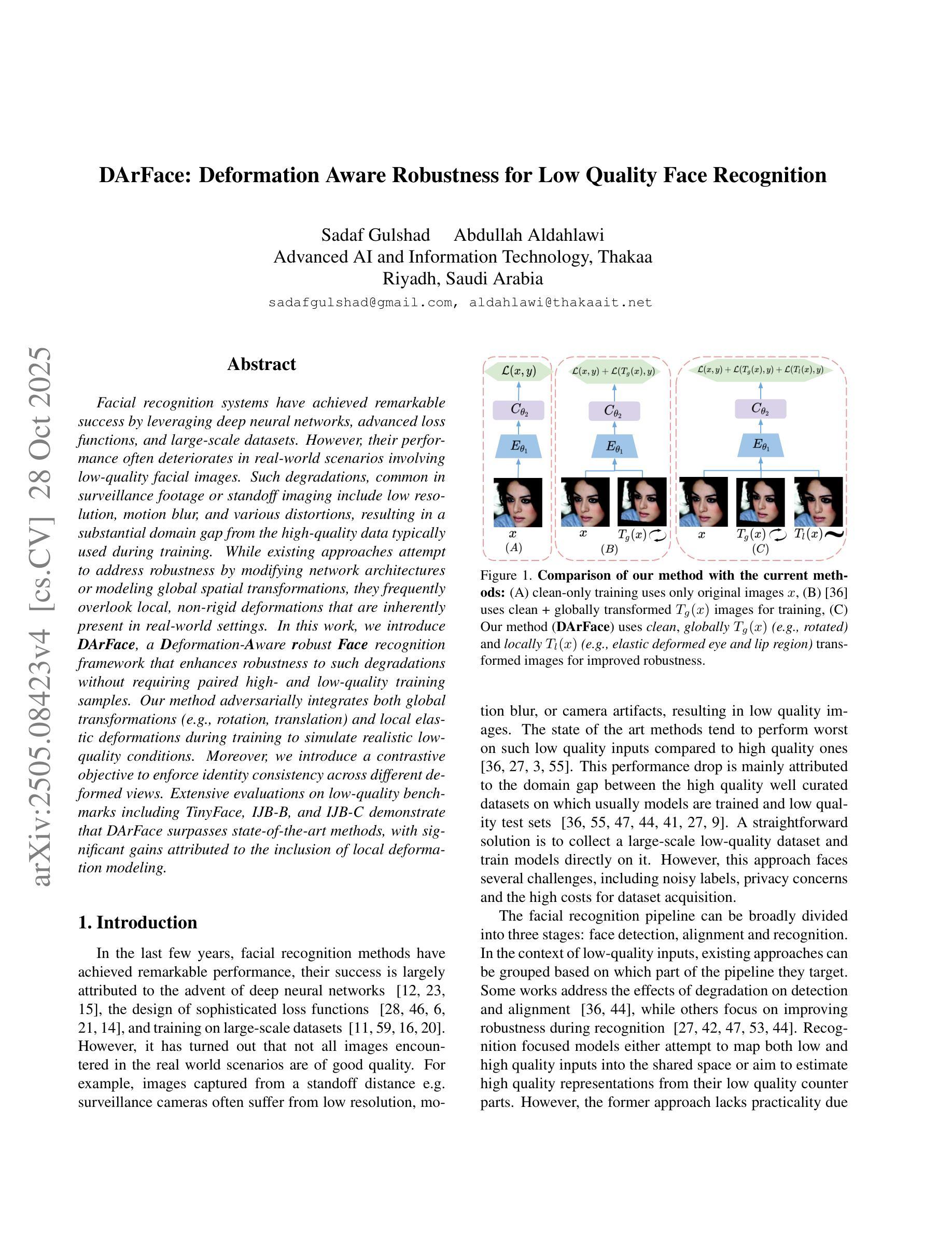 人脸识别系统通过深度神经网络、先进的损失函数和大规模数据集取得了显著的成功。但在涉及低质量人脸图像的实际情况中,其性能往往会下降。为解决这一问题,本文提出了DArFace框架,该框架增强了低质量图像的人脸识别鲁棒性,无需配对高低质量训练样本。通过模拟真实低质量条件,对抗性地结合了全局变换和局部弹性变形,并引入对比目标来强化不同变形视图之间的身份一致性。在低质量基准测试中,DArFace超越了最先进的方法,其中显著的提升归功于局部变形建模的引入。