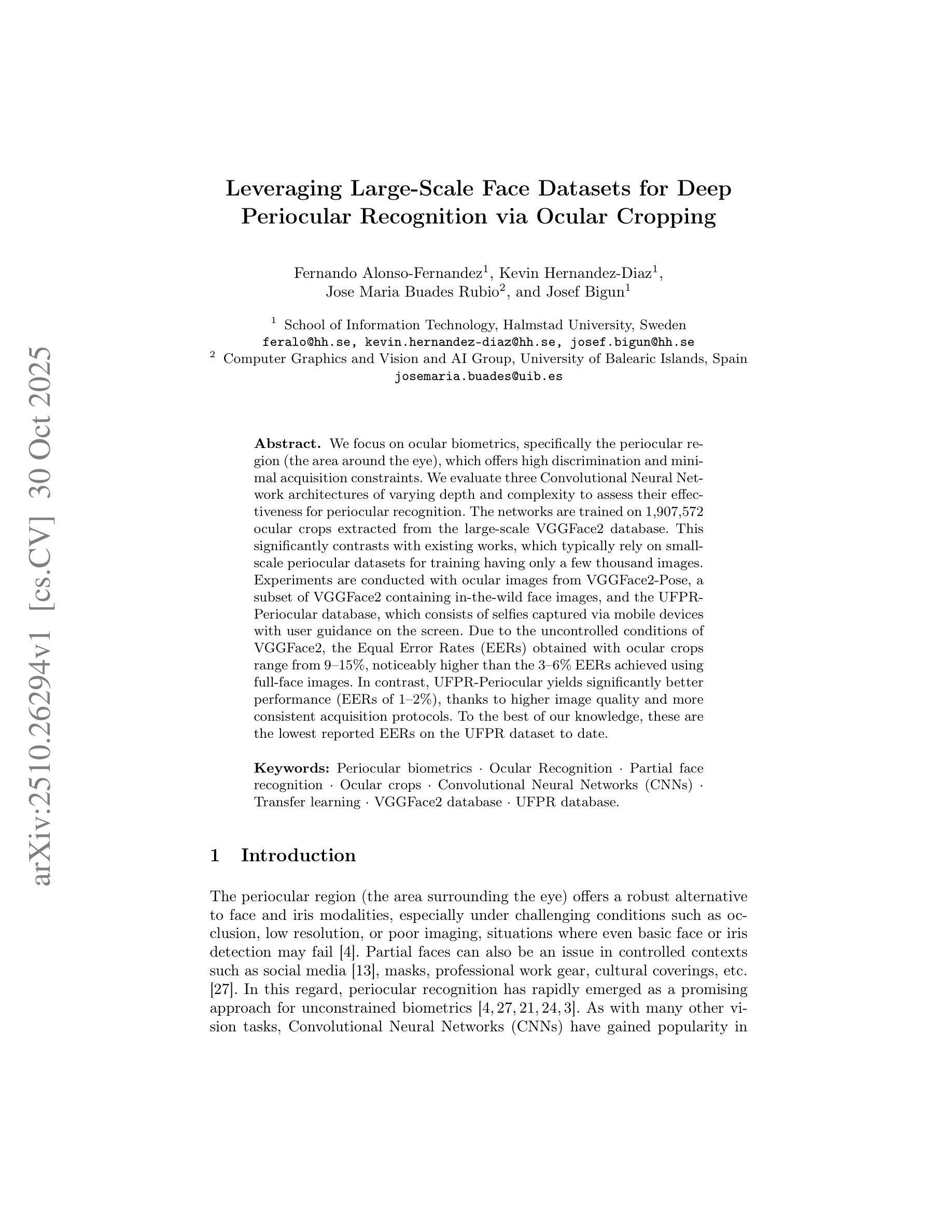 本文主要探讨了眼部生物识别技术,特别是围绕眼睛的区域(眼周生物识别)。通过评估三种不同深度和复杂程度的卷积神经网络架构,研究其在眼周识别中的有效性。训练数据来自大规模的VGGFace2数据库中的1907572个眼部图像片段,这与现有研究形成鲜明对比,现有研究通常只依赖包含数千张图片的小规模眼周数据集进行训练。实验采用包含自然场景面部图像的VGGFace2-Pose子集和通过移动设备拍摄的自拍图像组成的UFPR-Periocular数据库。由于VGGFace2的不受控条件,眼部图像片段的等误报率(EERs)在9-15%之间,明显高于使用全脸图像的3-6%的EERs。相比之下,UFPR-Periocular由于图像质量更高、采集协议更一致,表现优异,实现了迄今为止最低的EERs(1-2%)。