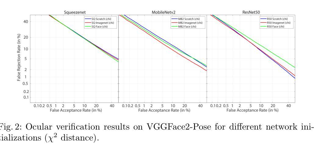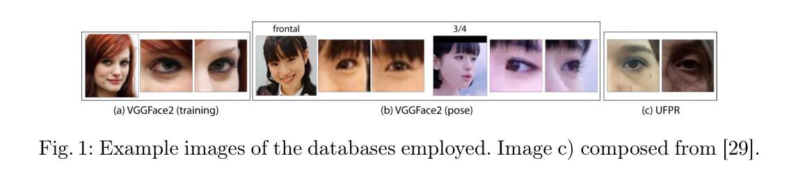 本文专注于眼部生物识别技术,特别是眼部周围区域(眼睛周围的区域),该区域具有高鉴别力和最小的采集限制。我们评估了三种不同深度和复杂度的卷积神经网络架构,以评估它们在眼部识别方面的有效性。这些网络在从大规模VGGFace2数据库中提取的1907572个眼部区域上进行训练。这与现有工作形成鲜明对比,现有工作通常依赖于仅包含几千张图像的小规模眼部数据集进行训练。实验是在VGGFace2的子集VGGFace2-Pose的面部图像以及UFPR-Periocular数据库上进行的,UFPR-Periocular数据库由用户指导在屏幕上通过移动设备拍摄的自拍照组成。由于VGGFace2的非控制条件,使用眼部区域获得的等误率(EERs)范围在9%\textasciitilde{}15%之间,明显高于使用全脸图像获得的3%\textasciitilde{}6%的EERs。相反,UFPR-Periocular由于图像质量更高和更一致的采集协议而表现更好(EERs为1%\textasciitilde{}2%),据我们所知,这是迄今为止在UFPR数据集上报告的最低EERs。