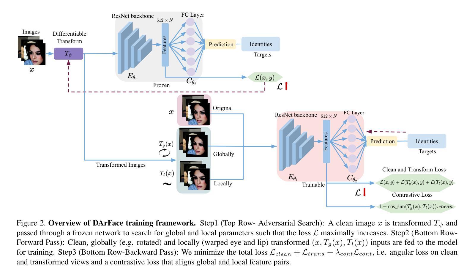 - DArFace引入了对比目标来强化不同变形视图之间的身份一致性。