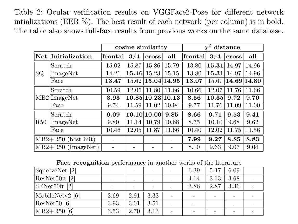 - 在VGGFace2数据集上,眼部图像的等误报率较高(9-15%)。