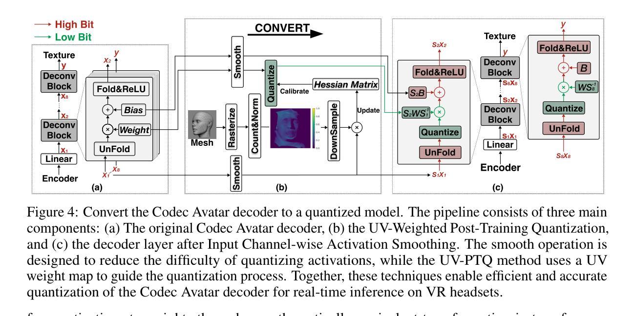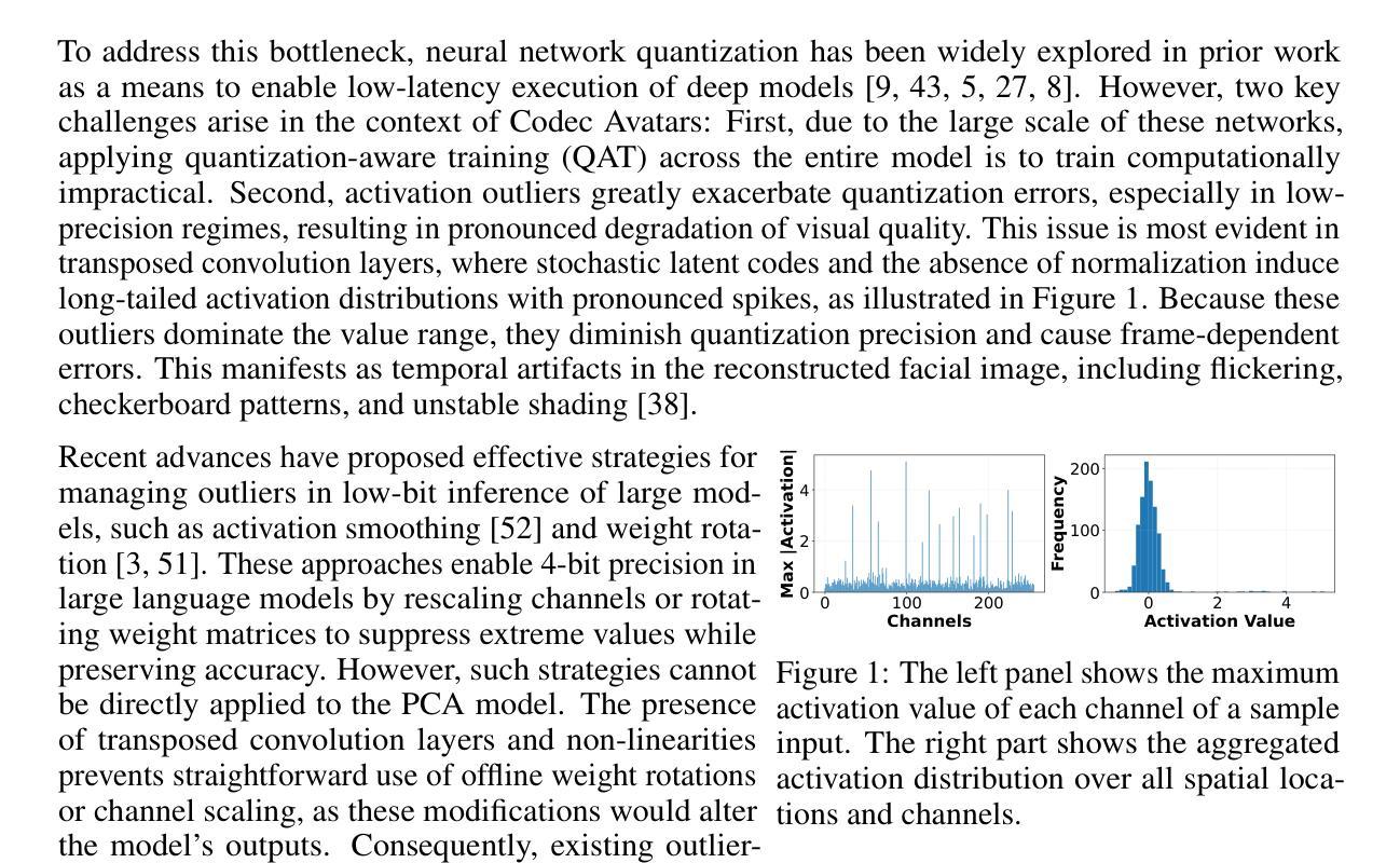 - 提出了一种针对Codec Avatar模型的高效后训练量化方法,允许在低精度下执行而不影响输出质量。