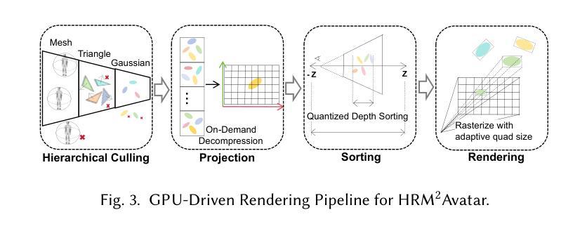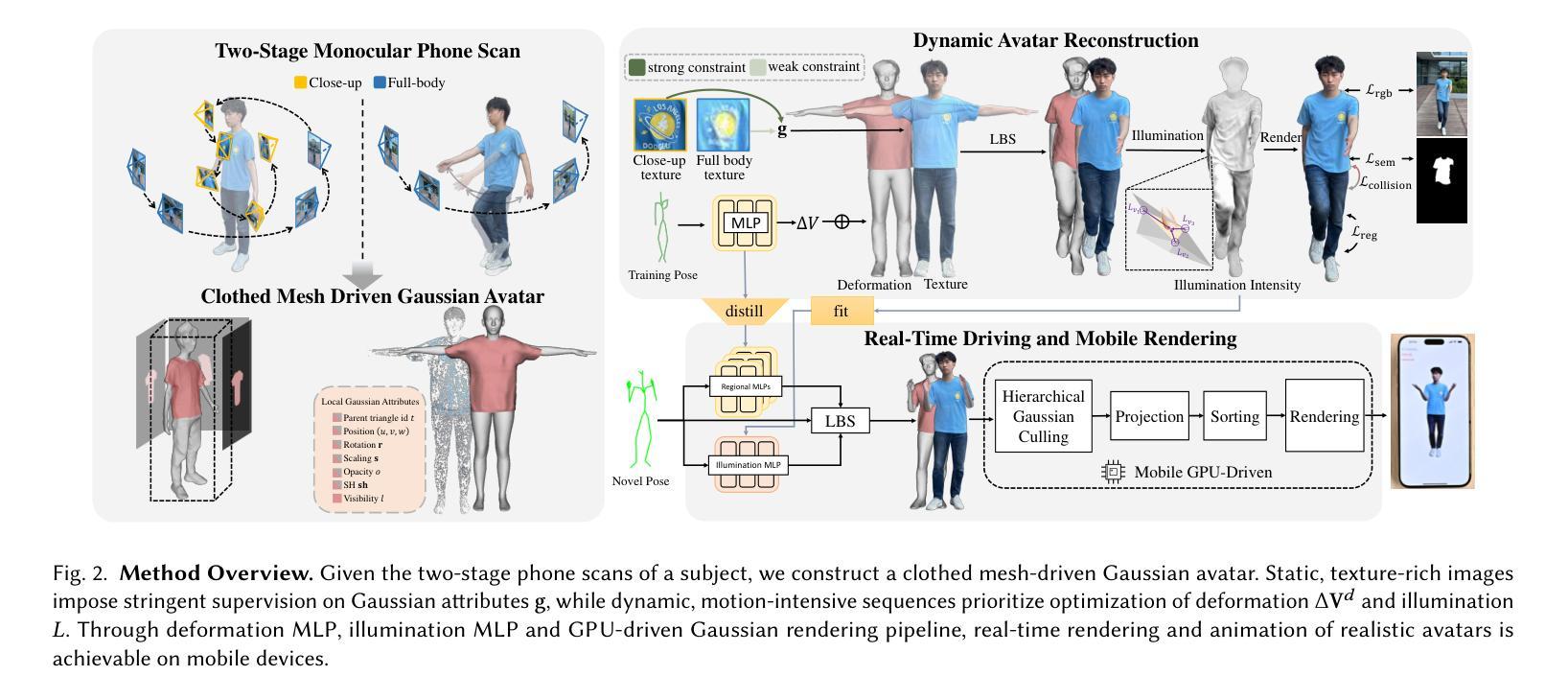 我们推出HRM$^2$Avatar框架,该框架可通过单目手机扫描创建高保真虚拟形象,并可在移动设备上实时呈现和动画。使用智能手机的单目捕获技术为专业级的多相机拍摄设备提供了低成本替代方案,使虚拟角色数字化对非专业用户变得触手可及。从单目视频序列重建高保真虚拟形象,由于有限的视觉和几何数据,这带来了挑战。为了克服这些限制,在数据层面,我们的方法利用智能手机捕获的两种类型的数据:静态姿势序列用于纹理重建和动态运动序列,以学习姿势相关的变形和光照变化。在表示层面,我们采用了一种轻便而富有表现力的表示方法,从稀疏的单目数据中重建高保真数字人类。我们从单目数据中提取服装网格,以有效地对服装变形进行建模,并将光照感知高斯附加到网格表面,以实现高保真渲染和捕捉姿势相关的照明。该表示法可以有效地从单目数据中学习高分辨率和动态信息,从而创建详细的虚拟形象。在渲染层面,对于在AR/VR、社交游戏和设备上创建中动画高保真虚拟形象而言,实时性能至关重要。我们的GPU驱动的渲染管道在移动设备上以每秒120帧的速度运行,在独立VR设备上以每秒90帧的速度运行,分辨率达到2K,比典型的移动引擎基准高出$ 2.7 \times $。实验表明,HRM$^2$Avatar在视觉真实感和实时交互方面表现出卓越的性能,优于最先进的单目方法。