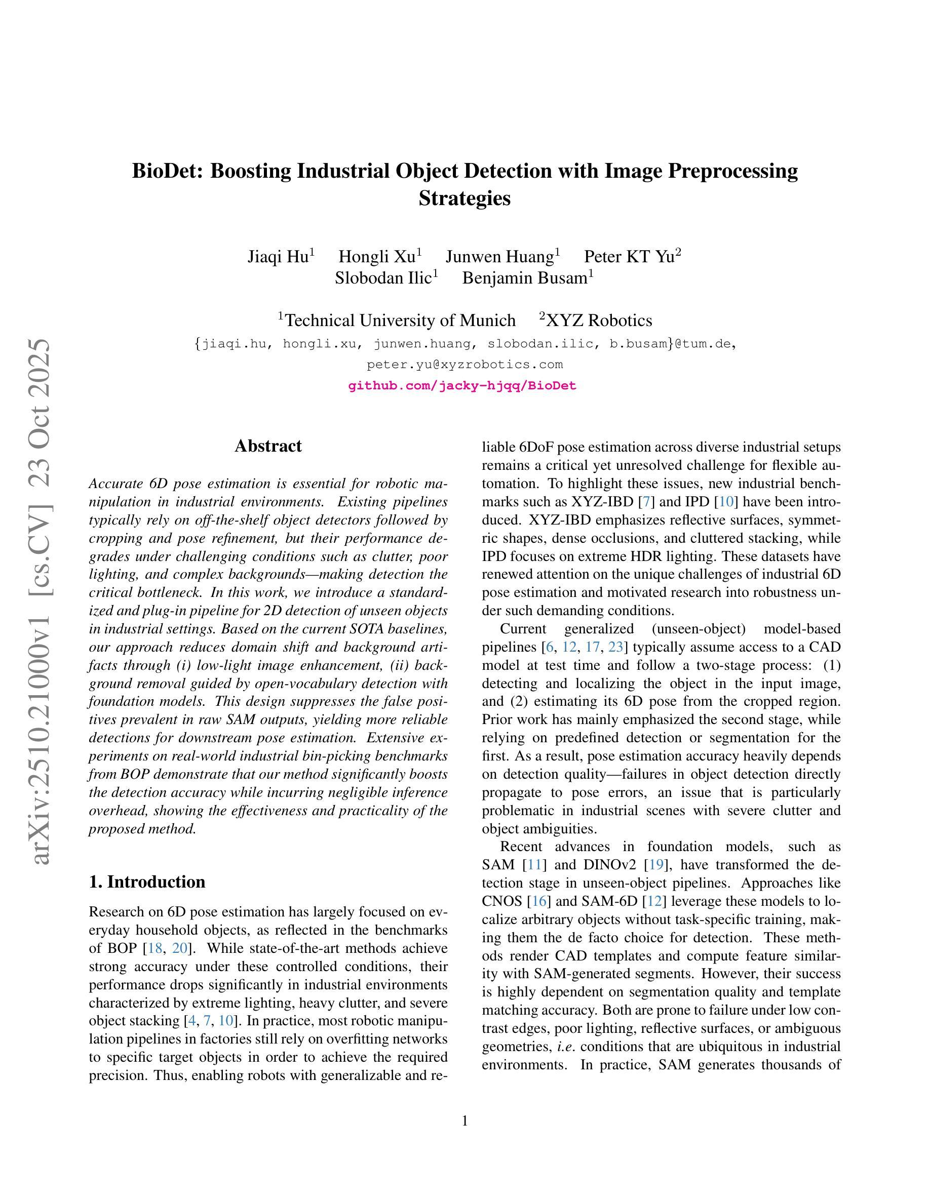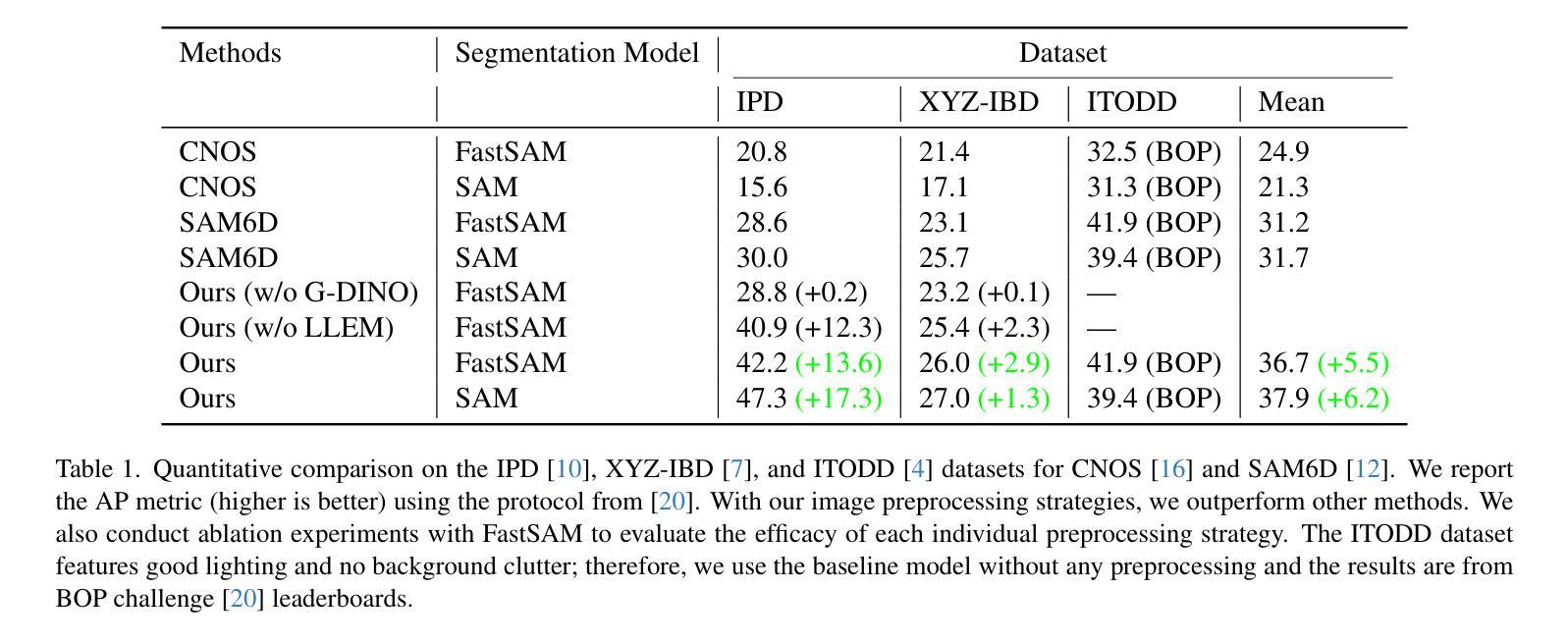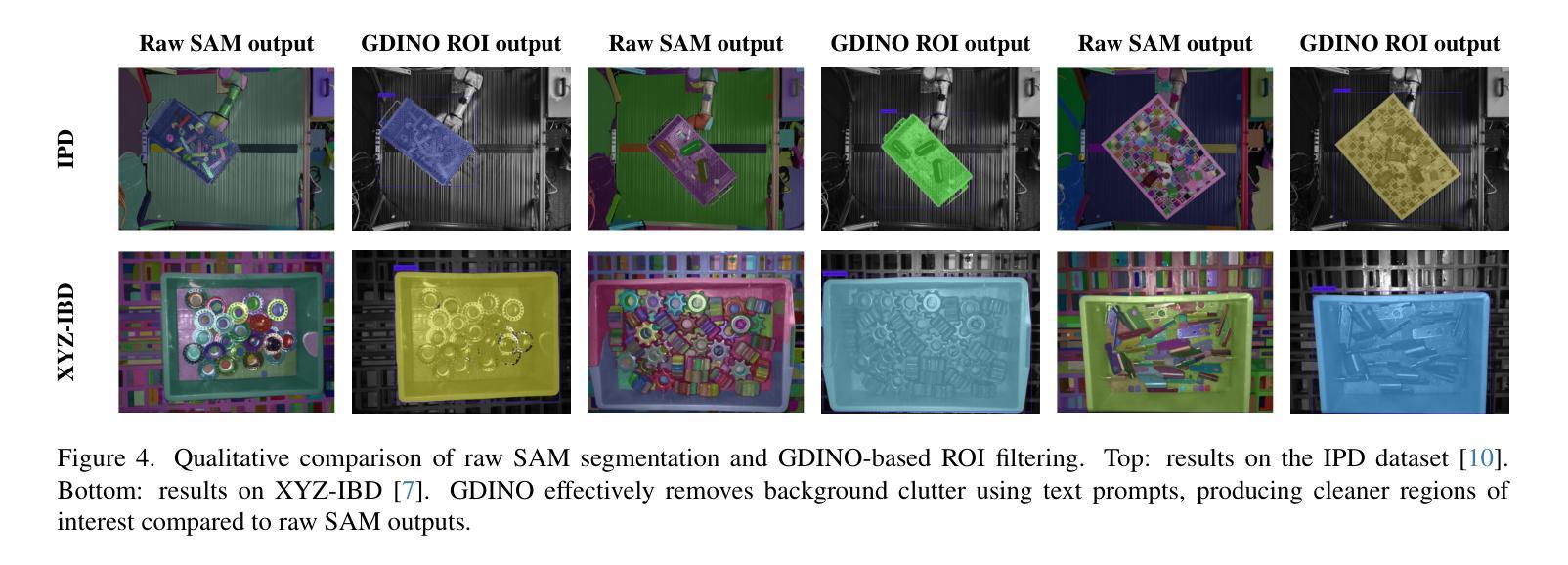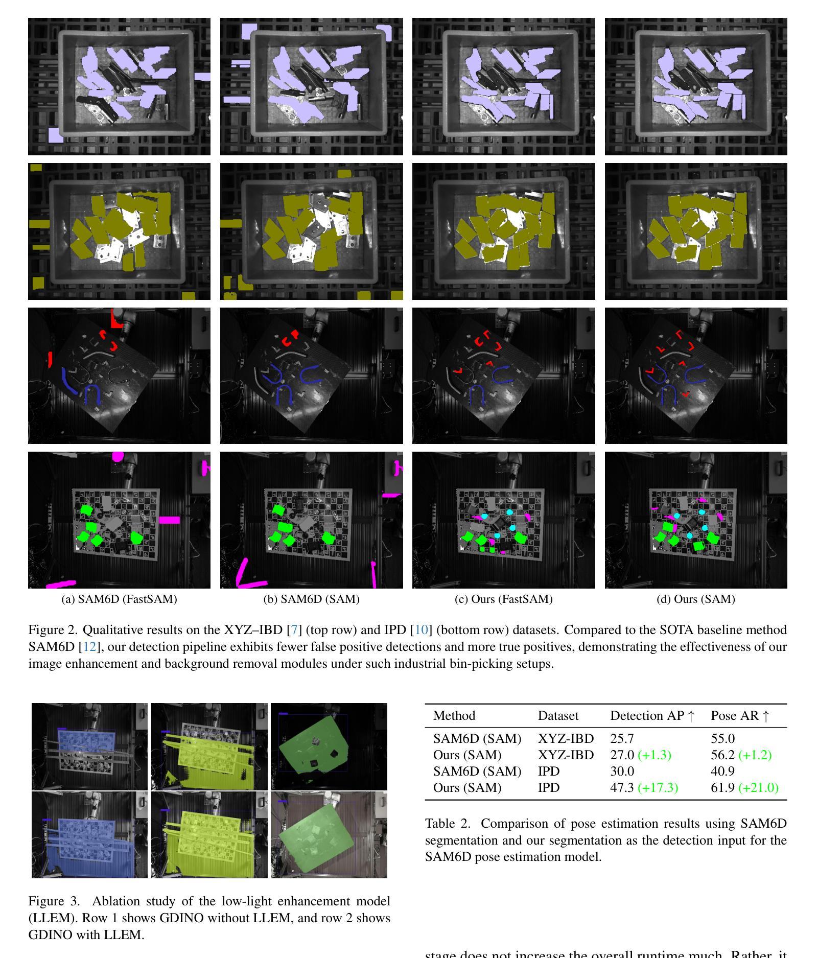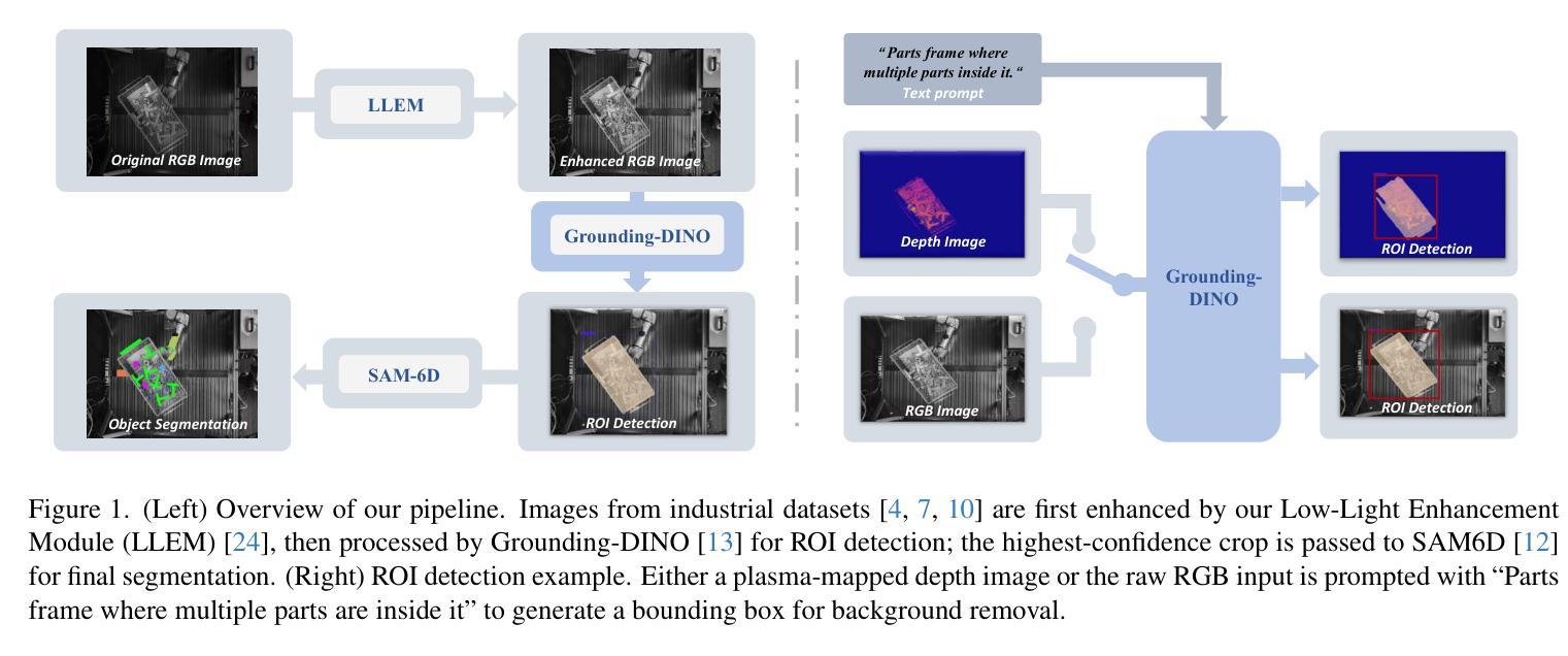 精确的6D姿态估计对于工业环境中的机器人操作至关重要。现有的流程通常依赖于现成的目标检测器,然后是裁剪和姿态优化,但在杂乱、光线不足和复杂背景等挑战条件下,它们的性能会下降,使得检测成为关键瓶颈。在这项工作中,我们为工业环境中未知对象的二维检测引入了一种标准化和可插入的流程。基于当前的最佳基线技术,我们的方法通过低光图像增强和背景去除技术减少了领域偏移和背景伪影,这由开放词汇检测引导并使用基础模型实现。这种设计抑制了原始SAM输出中普遍存在的误报,为下游姿态估计提供了更可靠的检测结果。在来自BOP的真实世界工业装箱挑选基准测试的大量实验表明,我们的方法在几乎不增加推理开销的情况下显著提高了检测精度,证明了所提出方法的有效性和实用性。