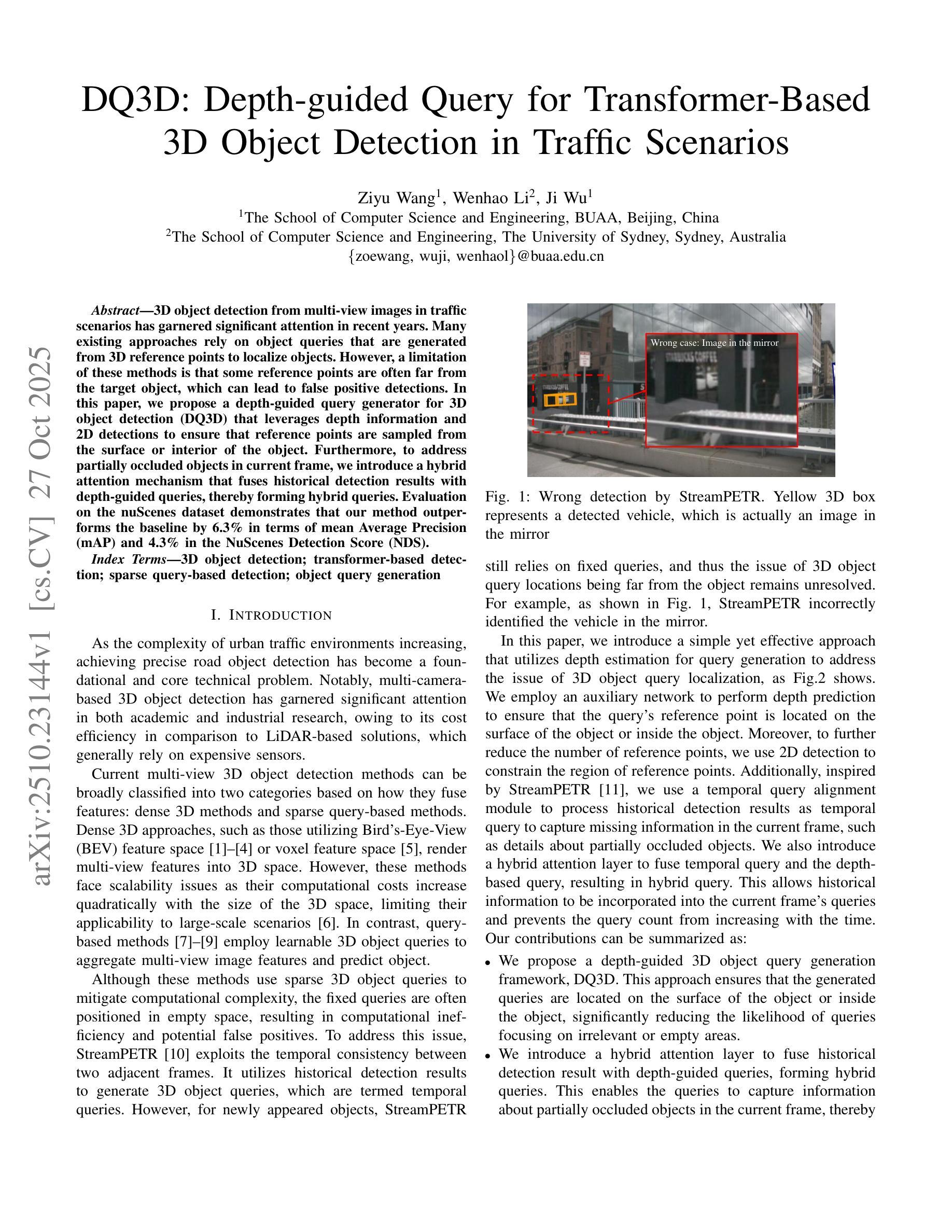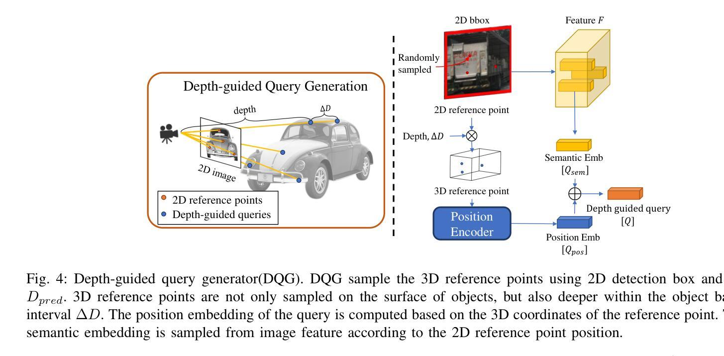 本文提出了一种深度引导查询生成器(DQ3D)用于交通场景中的三维物体检测。该方法利用深度信息和二维检测结果确保参考点从物体表面或内部采样,并引入混合注意力机制融合历史检测结果与深度引导查询,以处理当前帧中的部分遮挡物体。在nuScenes数据集上的评估表明,该方法在平均精度(mAP)和NuScenes检测得分(NDS)上分别提高了6.3%和4.3%。
