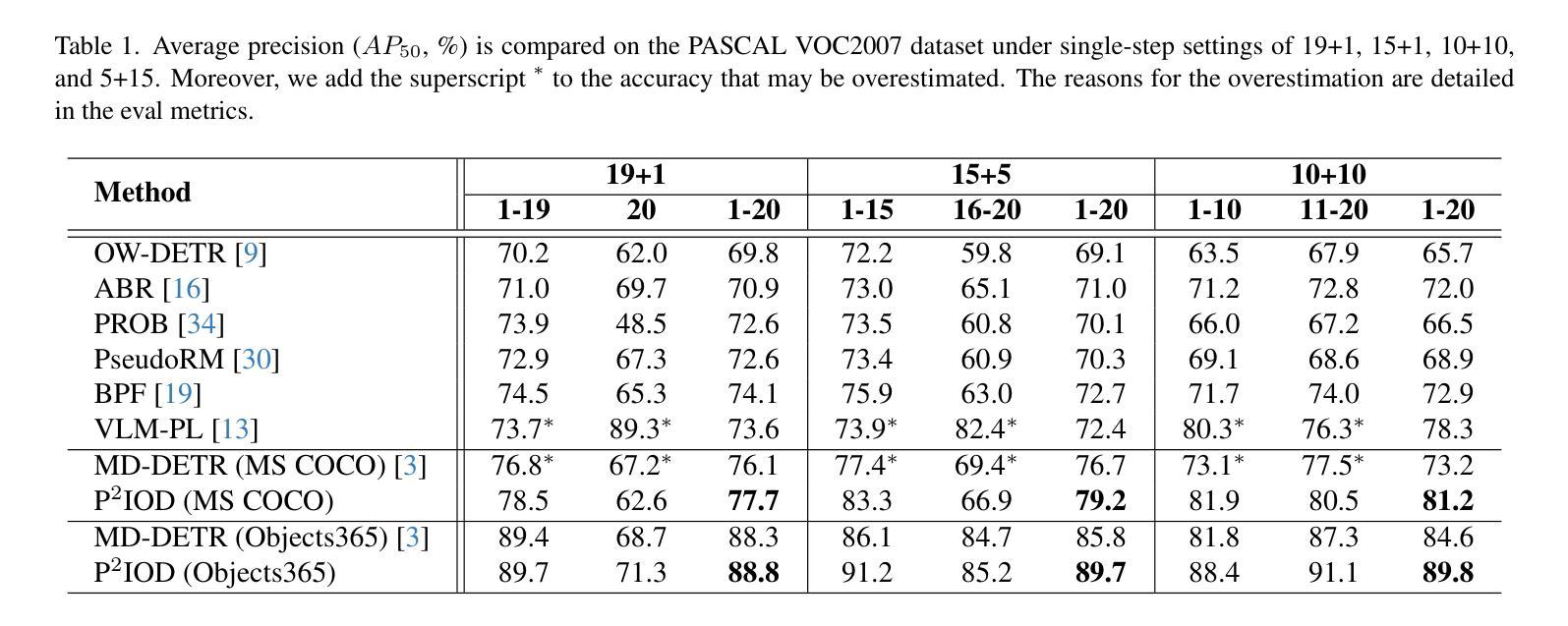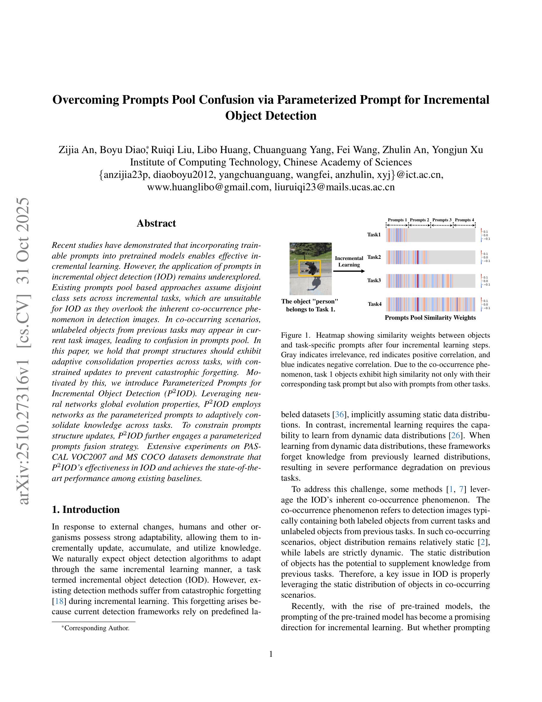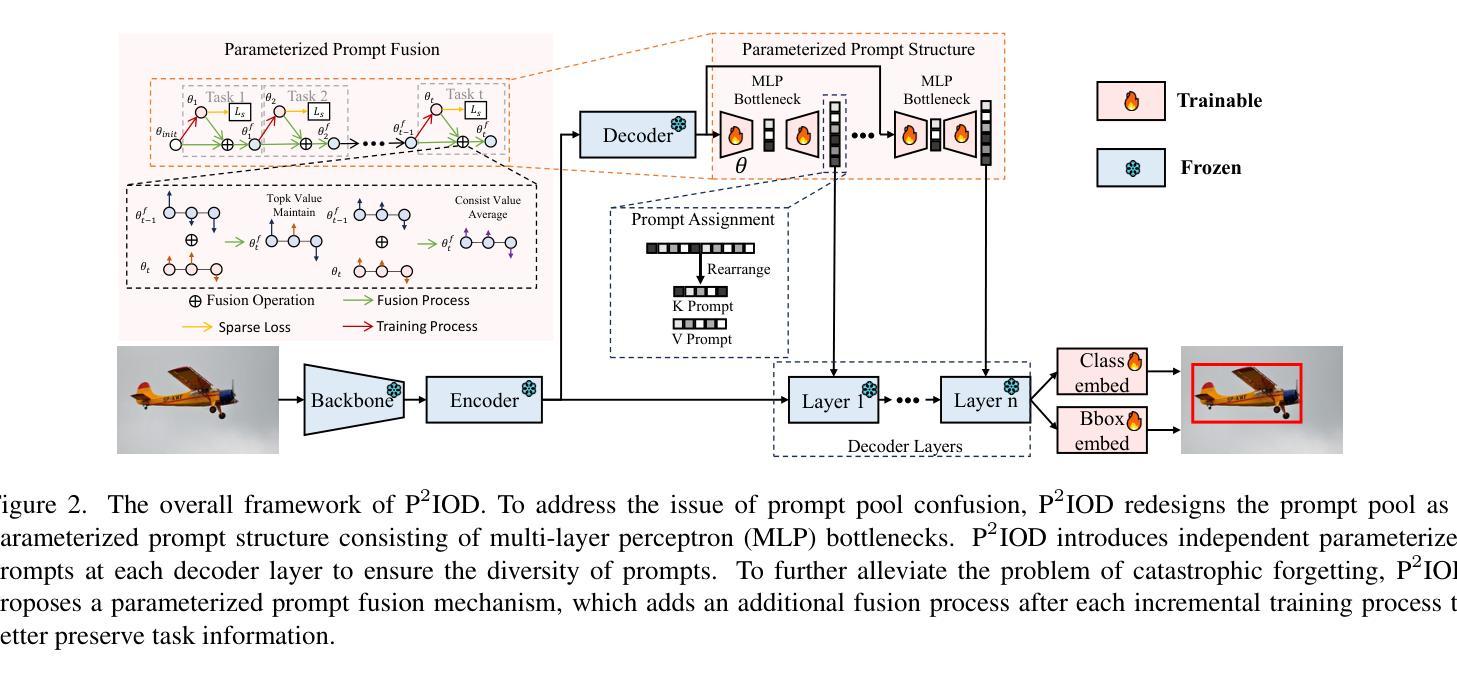 近期研究表明,将可训练提示融入预训练模型可实现有效的增量学习。然而,在增量目标检测(IOD)中提示的应用仍被忽视。当前基于提示池的方法假设跨增量任务的类别集是不相交的,这不适用于IOD,因为忽视了检测图像中固有的共现现象。共现场景中,来自先前任务的无标签对象可能会出现在当前任务图像中,导致提示池混淆。本文认为,提示结构应展现跨任务的自适应整合特性,并有限制性更新来防止灾难性遗忘。因此,我们提出用于增量目标检测的带参数提示(P²IOD)。利用神经网络全局进化特性,P²IOD利用网络作为带参数提示来跨任务自适应整合知识。为了限制提示结构更新,P²IOD进一步采用带参数提示融合策略。在PASCAL VOC2007和MS COCO数据集上的广泛实验证明,P²IOD在IOD中的有效性以及相较于现有基准测试方法的卓越性能。