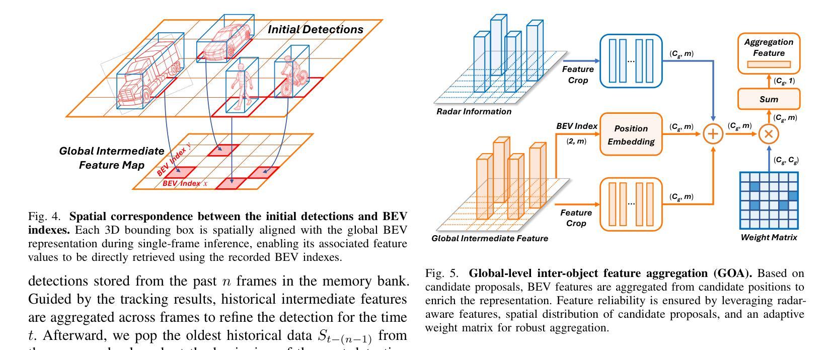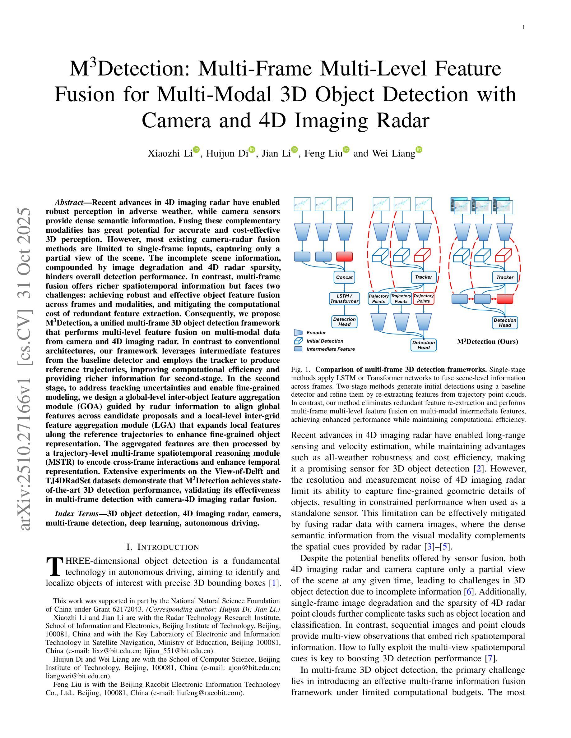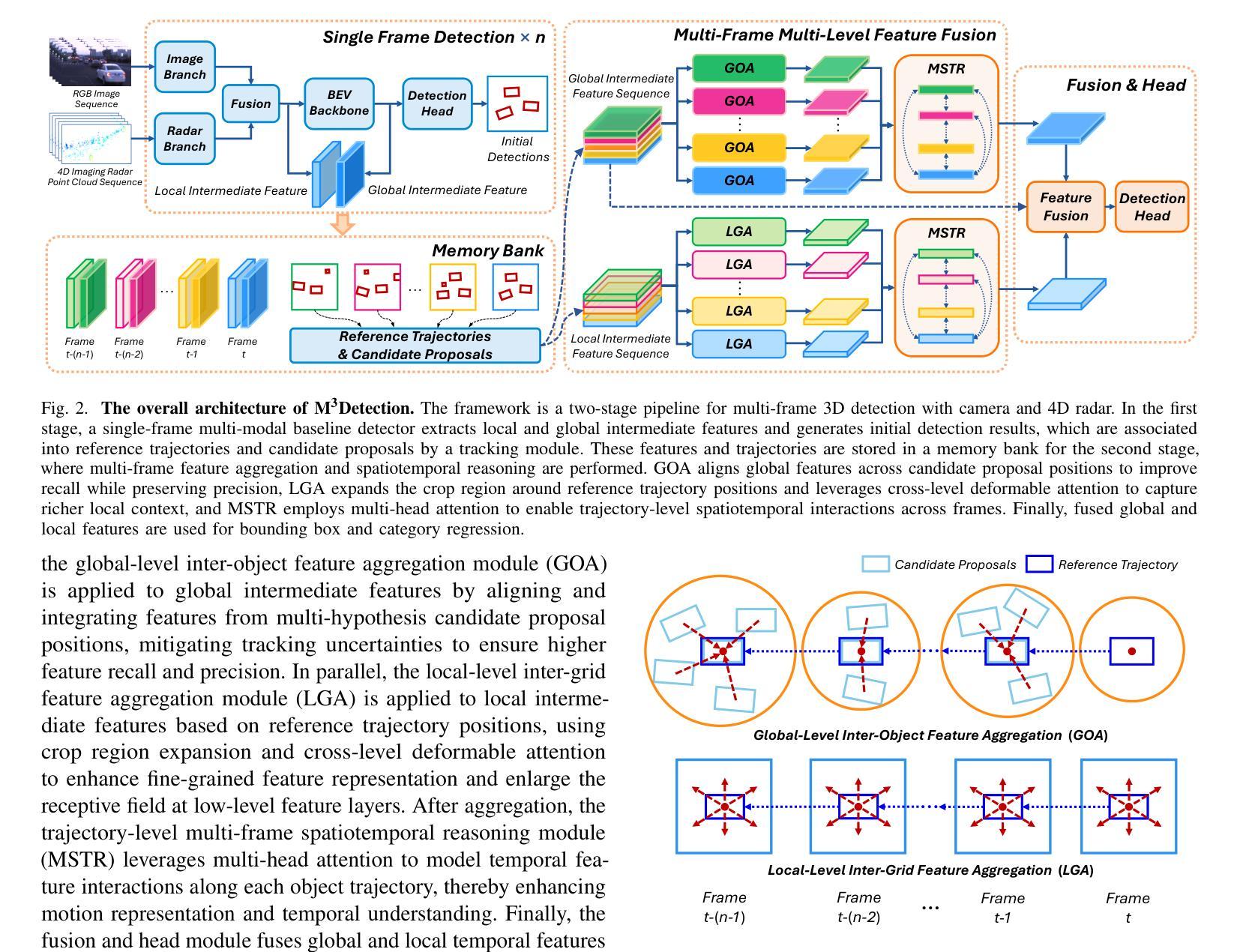 近期4D成像雷达技术的进展使得在恶劣天气下的稳健感知成为可能,而相机传感器提供了密集语义信息。融合这些互补模态在成本效益高的3D感知方面具有巨大潜力。然而,现有的相机雷达融合方法大多仅限于单帧输入,只能捕捉场景的部分视图。不完整的场景信息加上图像退化和4D雷达稀疏性,阻碍了整体检测性能。相比之下,多帧融合提供了更丰富的时空信息,但面临两个挑战:实现跨帧和跨模态的稳健有效的目标特征融合,并减少冗余特征提取的计算成本。因此,我们提出了M^3Detection,这是一个统一的多帧3D目标检测框架,对来自相机和4D成像雷达的多模态数据进行多层次特征融合。我们的框架利用基线检测器的中间特征,并使用跟踪器生成参考轨迹,提高计算效率并为第二阶段提供更丰富的信息。在第二阶段,我们设计了一个受雷达信息引导的全局级目标间特征聚合模块,以对齐候选提案的全局特征,以及一个局部级网格间特征聚合模块,该模块沿着参考轨迹扩展局部特征,以增强精细目标表示。然后,聚集的特征通过轨迹级多帧时空推理模块进行处理,以编码跨帧交互并增强时间表示。在VoD和TJ4DRadSet数据集上的大量实验表明,M^3Detection达到了最先进的3D检测性能,验证了其在多帧检测与相机4D成像雷达融合方面的有效性。