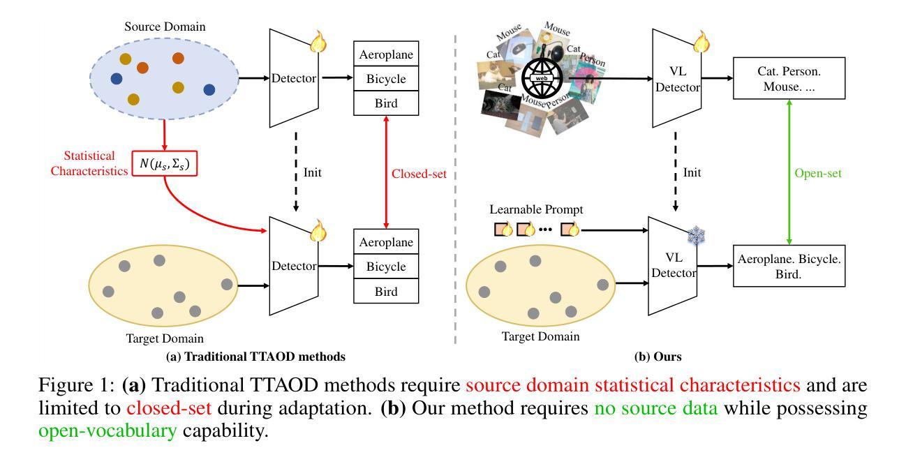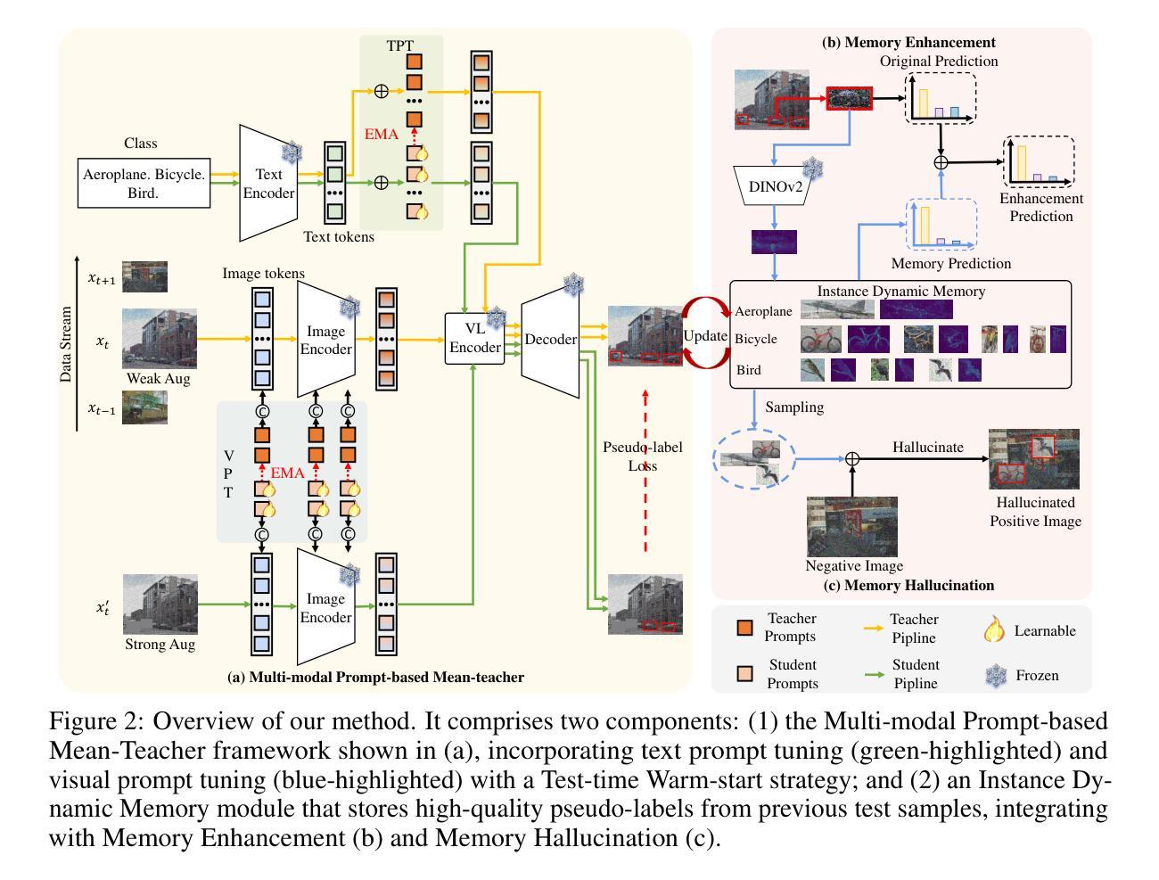 近年来,测试时自适应目标检测因其在在线域自适应中的独特优势而备受关注。然而,现有方法高度依赖于源派生统计特征,并假设源域和目标域具有相同的类别空间,这限制了其实际应用。本文提出了一种基于基础模型的测试时自适应目标检测方法,无需源数据,突破了传统封闭集的局限。该方法设计了一个多模态提示基础的Mean-Teacher框架,结合文本和视觉提示调整,以参数有效的方式在测试数据上适应语言和视觉表示空间。同时,提出了测试时预热策略,针对视觉提示进行有效保留视觉分支的表示能力。为保证每批测试样本的高质量伪标签,维护了一个实例动态内存模块,并提出两种新策略来利用高质量实例增强原始预测和虚构无伪标签的图像。实验证明,该方法在跨腐败和跨数据集基准测试上始终优于先前的方法,并可适应任意跨域和跨类别的目标数据。