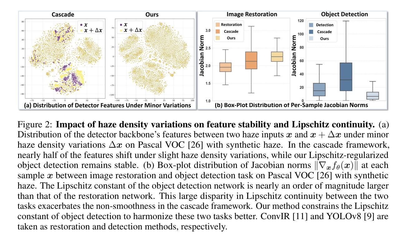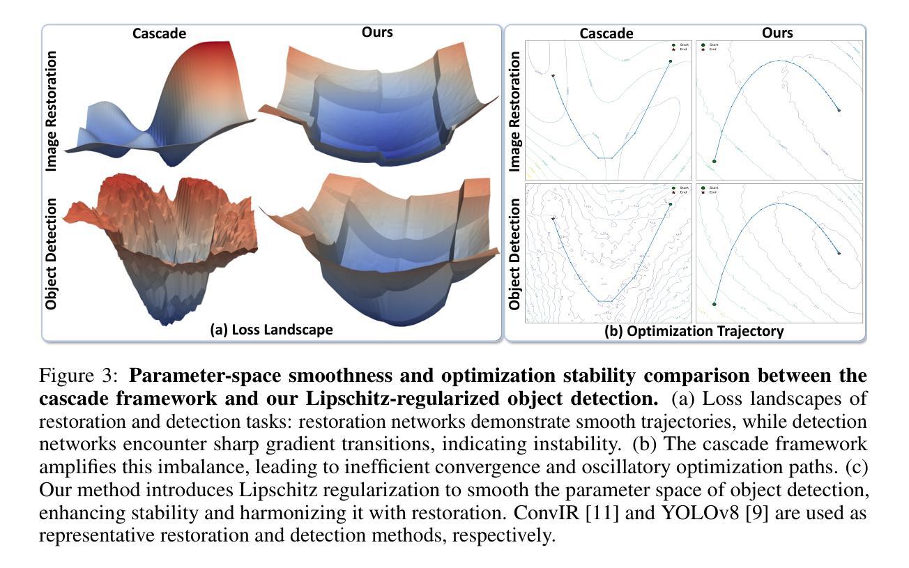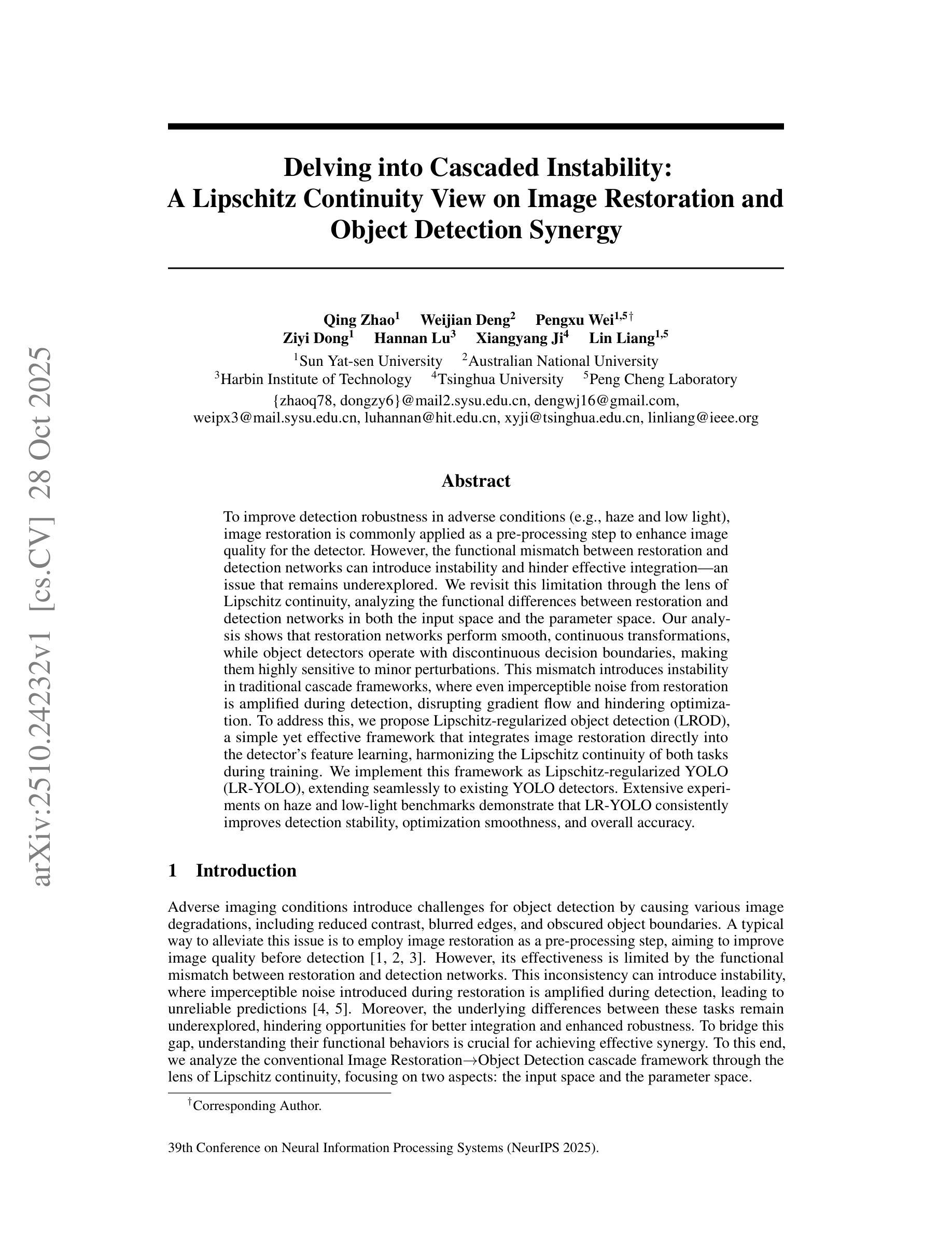 在恶劣环境下(如雾霾和低光照)提高检测稳健性的研究中,图像修复作为预处理步骤被广泛应用于提高图像质量以供检测器使用。然而,修复和检测网络之间的功能不匹配会引发不稳定并阻碍有效集成,这一问题尚未得到充分探索。本文通过Lipschitz连续性来分析修复和检测网络在输入空间和参数空间中的功能差异。分析表明,修复网络执行平滑、连续的转换,而对象检测器则具有不连续的决策边界,使其对微小扰动高度敏感。这种不匹配在传统级联框架中引入了不稳定性,其中来自修复的几乎无法察觉的噪声在检测过程中会被放大,破坏梯度流并阻碍优化。针对这一问题,我们提出了Lipschitz正则化目标检测(LROD),这是一种简单有效的框架,直接将图像修复集成到检测器的特征学习中,在训练过程中协调两个任务的Lipschitz连续性。我们在YOLO检测器上实现了此框架的Lipschitz正则化版本(LR-YOLO),可无缝集成到现有YOLO检测器中。在雾霾和低光基准测试上的大量实验表明,LR-YOLO在检测稳定性、优化平滑度和总体准确性方面均有所提高。
