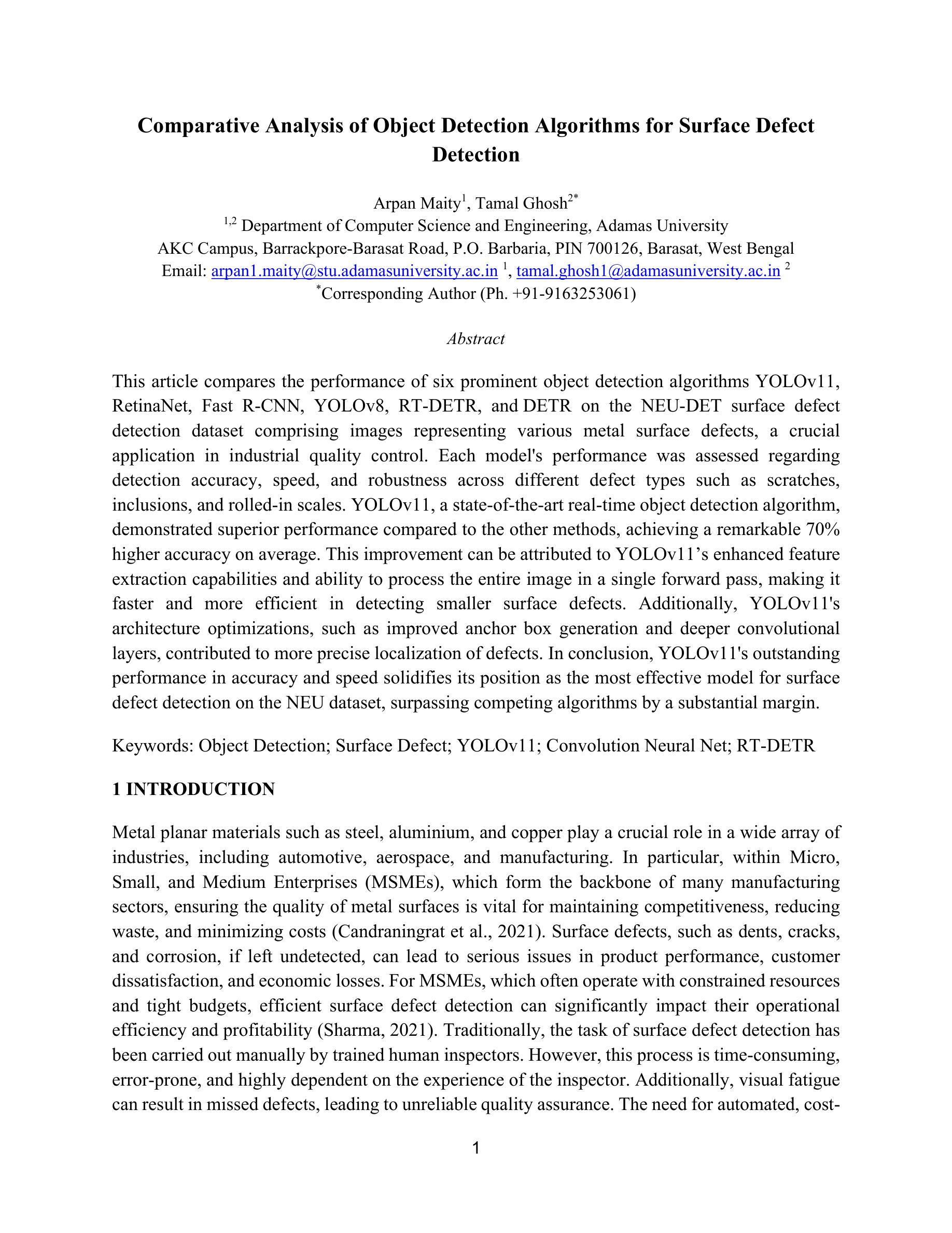 This article compares the performance of six prominent object detection algorithms, YOLOv11, RetinaNet, Fast R-CNN, YOLOv8, RT-DETR, and DETR, on the NEU-DET surface defect detection dataset, comprising images representing various metal surface defects, a crucial application in industrial quality control. Each model’s performance was assessed regarding detection accuracy, speed, and robustness across different defect types such as scratches, inclusions, and rolled-in scales. YOLOv11, a state-of-the-art real-time object detection algorithm, demonstrated superior performance compared to the other methods, achieving a remarkable 70% higher accuracy on average. This improvement can be attributed to YOLOv11s enhanced feature extraction capabilities and ability to process the entire image in a single forward pass, making it faster and more efficient in detecting minor surface defects. Additionally, YOLOv11’s architecture optimizations, such as improved anchor box generation and deeper convolutional layers, contributed to more precise localization of defects. In conclusion, YOLOv11’s outstanding performance in accuracy and speed solidifies its position as the most effective model for surface defect detection on the NEU dataset, surpassing competing algorithms by a substantial margin.