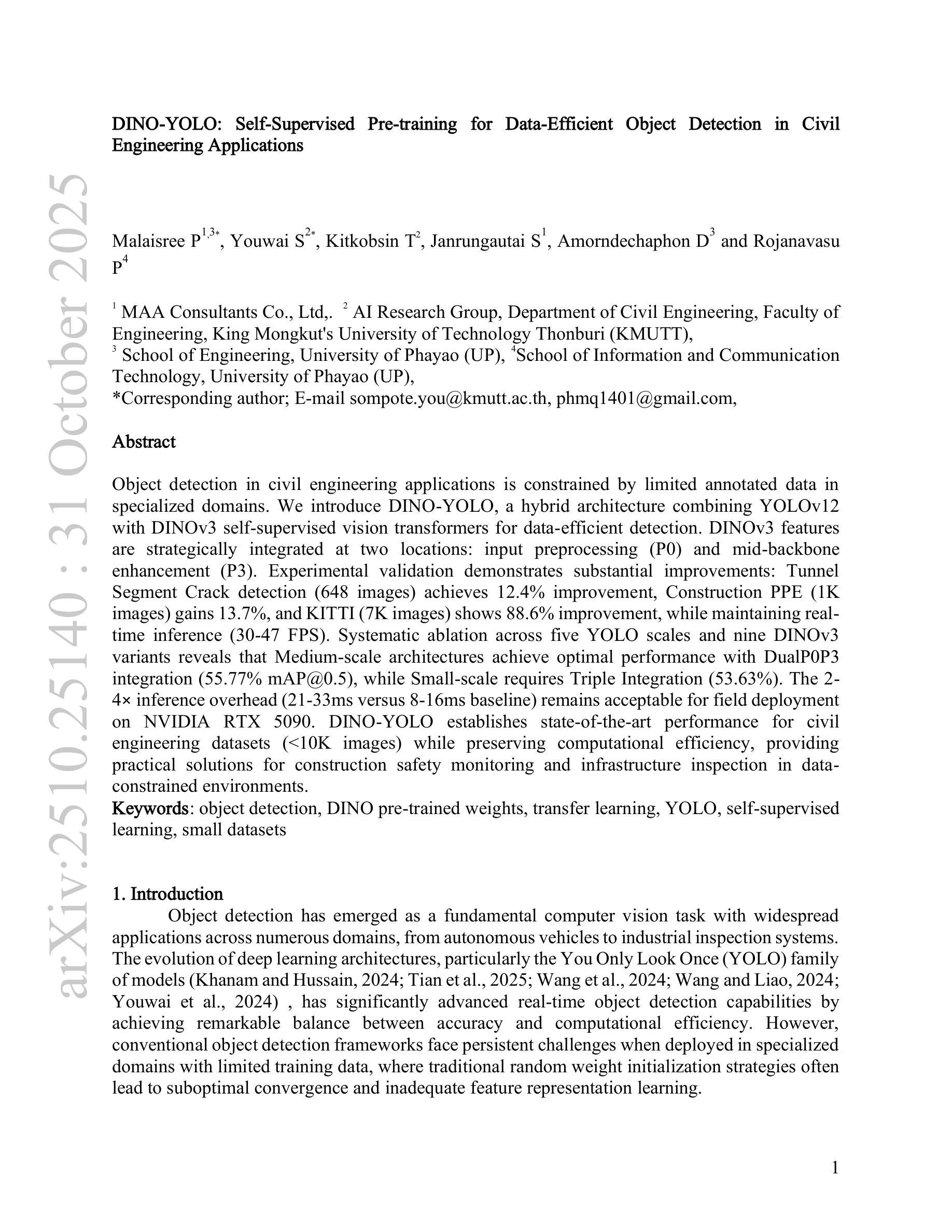 - 引入DINO-YOLO混合架构,结合了YOLOv12和DINOv3技术,适用于土木工程中的目标检测。