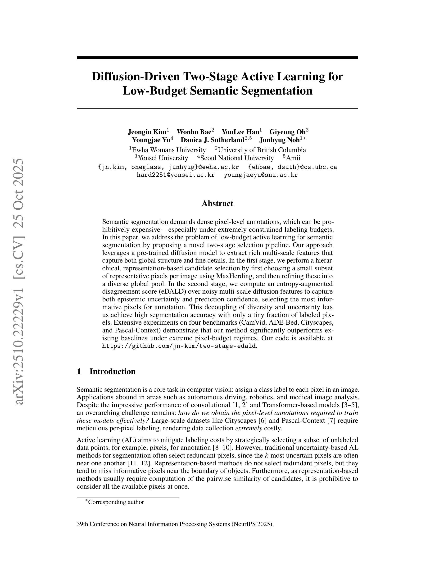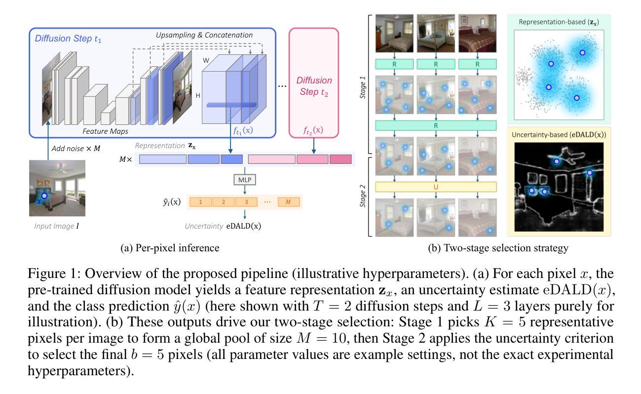 语义分割需要密集的像素级标注,这可能会非常昂贵——特别是在标注预算极其有限的情况下。本文解决了低预算主动学习中语义分割的问题,通过提出一种新型的两阶段选择流程。我们的方法利用预训练的扩散模型来提取丰富的多尺度特征,这些特征既能捕捉全局结构,又能捕捉细节。在第一阶段,我们基于表示进行分层候选选择,首先使用MaxHerding选择每幅图像中具有代表性的小部分像素,然后将其细化为多样化的全局池。在第二阶段,我们计算带有熵增强的分歧分数(eDALD),通过对噪声多尺度扩散特征进行建模,以捕捉认知不确定性和预测置信度,选择信息量最大的像素进行标注。多样性和不确定性的这种解耦让我们仅使用一小部分标记像素就能实现高分割精度。在CamVid、ADE-Bed、Cityscapes和Pascal-Context四个基准测试上的广泛实验表明,在极端像素预算条件下,我们的方法显著优于现有基线。我们的代码位于https://github.com/jn-kim/two-stage-edald。