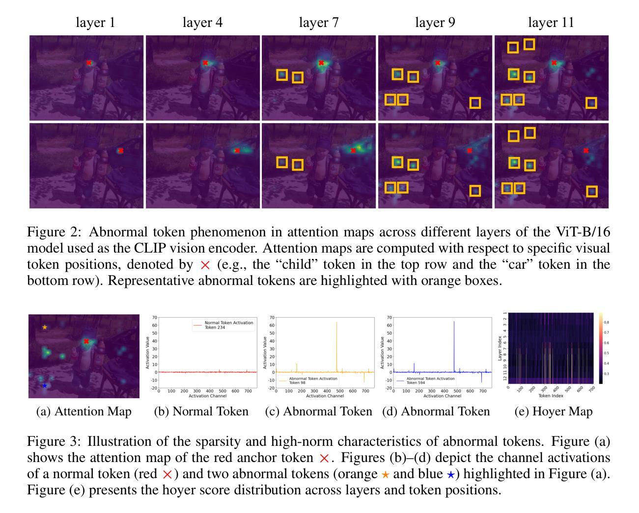 - 研究发现:最终层主要强化图像文本对齐,但牺牲了视觉辨别能力;部分注意力头在所有数据集中始终表现出强大的视觉辨别能力;异常令牌具有稀疏且一致的激活模式。