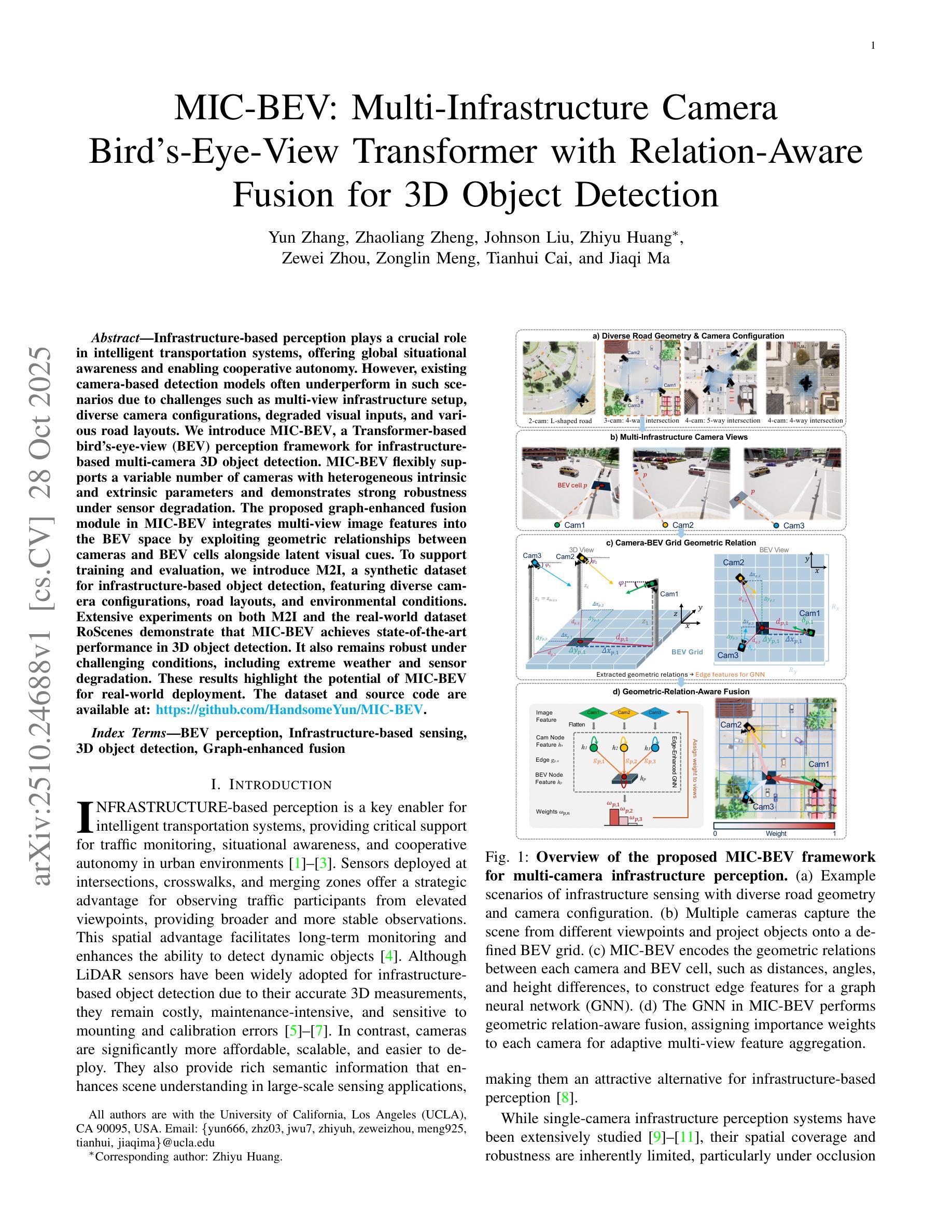 基于基础设施的感知在智能交通系统中扮演重要角色,提供全局态势感知并实现协同自主。然而,现有基于摄像头的检测模型在这种场景下表现不佳,面临多视角基础设施设置、不同摄像头配置、视觉输入退化以及道路布局多样等挑战。为此,我们提出了基于Transformer的俯视图感知框架MIC-BEV,支持多种基础设施摄像头的三维物体检测。MIC-BEV灵活支持不同数量的摄像头和多样化的内外参数,在传感器退化情况下表现出强大的稳健性。其创新的图增强融合模块利用摄像头与俯视图单元之间的几何关系以及潜在视觉线索,将多视角图像特征融合到俯视图空间中。为了支持和评估模型,我们创建了M2I这一合成数据集,涵盖不同的摄像头配置、道路布局和环境条件。在M2I和真实世界数据集RoScenes上的大量实验表明,MIC-BEV在三维物体检测方面达到最新性能水平,并在极端天气和传感器退化等挑战条件下保持稳健。