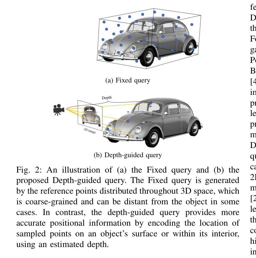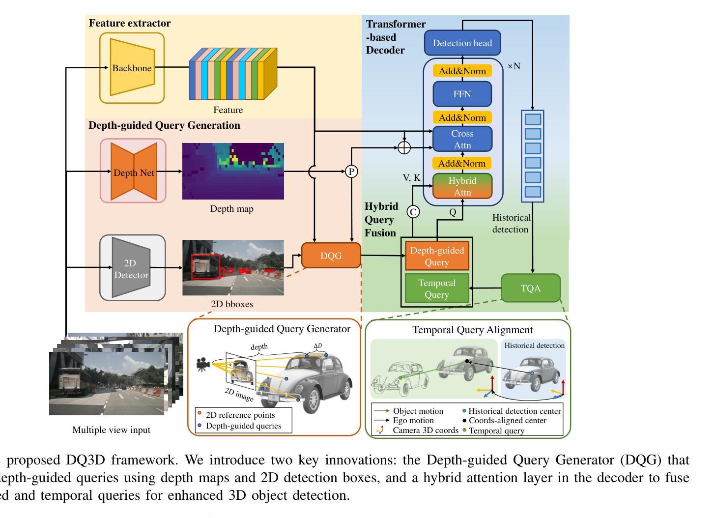 近年来,交通场景中从多视角图像进行3D目标检测已经引起了广泛关注。许多现有方法依赖于从3D参考点生成的目标查询来定位目标。然而,这些方法的局限性在于,某些参考点往往远离目标物体,从而导致误报。在本文中,我们提出了一种用于3D目标检测的深度引导查询生成器(DQ3D),它利用深度信息和2D检测结果,确保参考点从物体表面或内部采样。此外,为了解决当前帧中部分遮挡物体的问题,我们引入了一种混合注意机制,该机制将历史检测结果与深度引导查询相融合,形成混合查询。在nuScenes数据集上的评估表明,我们的方法在平均精度(mAP)上比基线高出6.3%,在NuScenes检测分数(NDS)上高出4.3%。