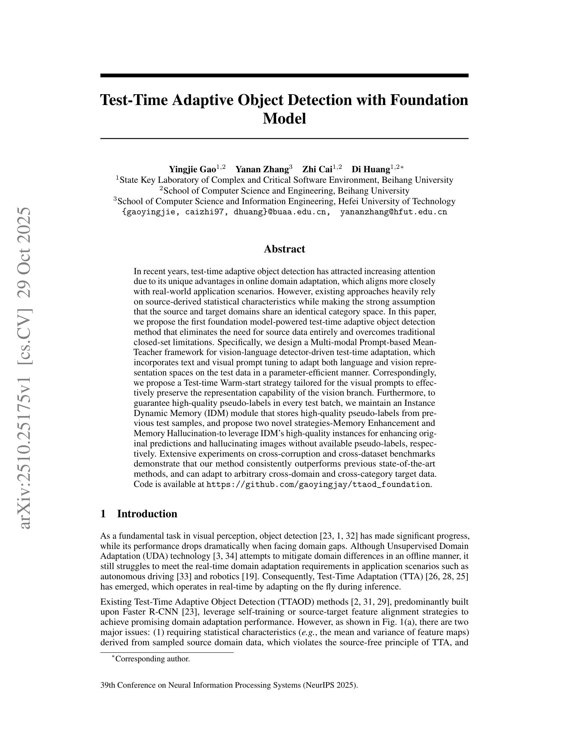 In recent years, test-time adaptive object detection has attracted increasing attention due to its unique advantages in online domain adaptation, which aligns more closely with real-world application scenarios. However, existing approaches heavily rely on source-derived statistical characteristics while making the strong assumption that the source and target domains share an identical category space. In this paper, we propose the first foundation model-powered test-time adaptive object detection method that eliminates the need for source data entirely and overcomes traditional closed-set limitations. Specifically, we design a Multi-modal Prompt-based Mean-Teacher framework for vision-language detector-driven test-time adaptation, which incorporates text and visual prompt tuning to adapt both language and vision representation spaces on the test data in a parameter-efficient manner. Correspondingly, we propose a Test-time Warm-start strategy tailored for the visual prompts to effectively preserve the representation capability of the vision branch. Furthermore, to guarantee high-quality pseudo-labels in every test batch, we maintain an Instance Dynamic Memory (IDM) module that stores high-quality pseudo-labels from previous test samples, and propose two novel strategies-Memory Enhancement and Memory Hallucination-to leverage IDM’s high-quality instances for enhancing original predictions and hallucinating images without available pseudo-labels, respectively. Extensive experiments on cross-corruption and cross-dataset benchmarks demonstrate that our method consistently outperforms previous state-of-the-art methods, and can adapt to arbitrary cross-domain and cross-category target data. Code is available at https://github.com/gaoyingjay/ttaod_foundation.