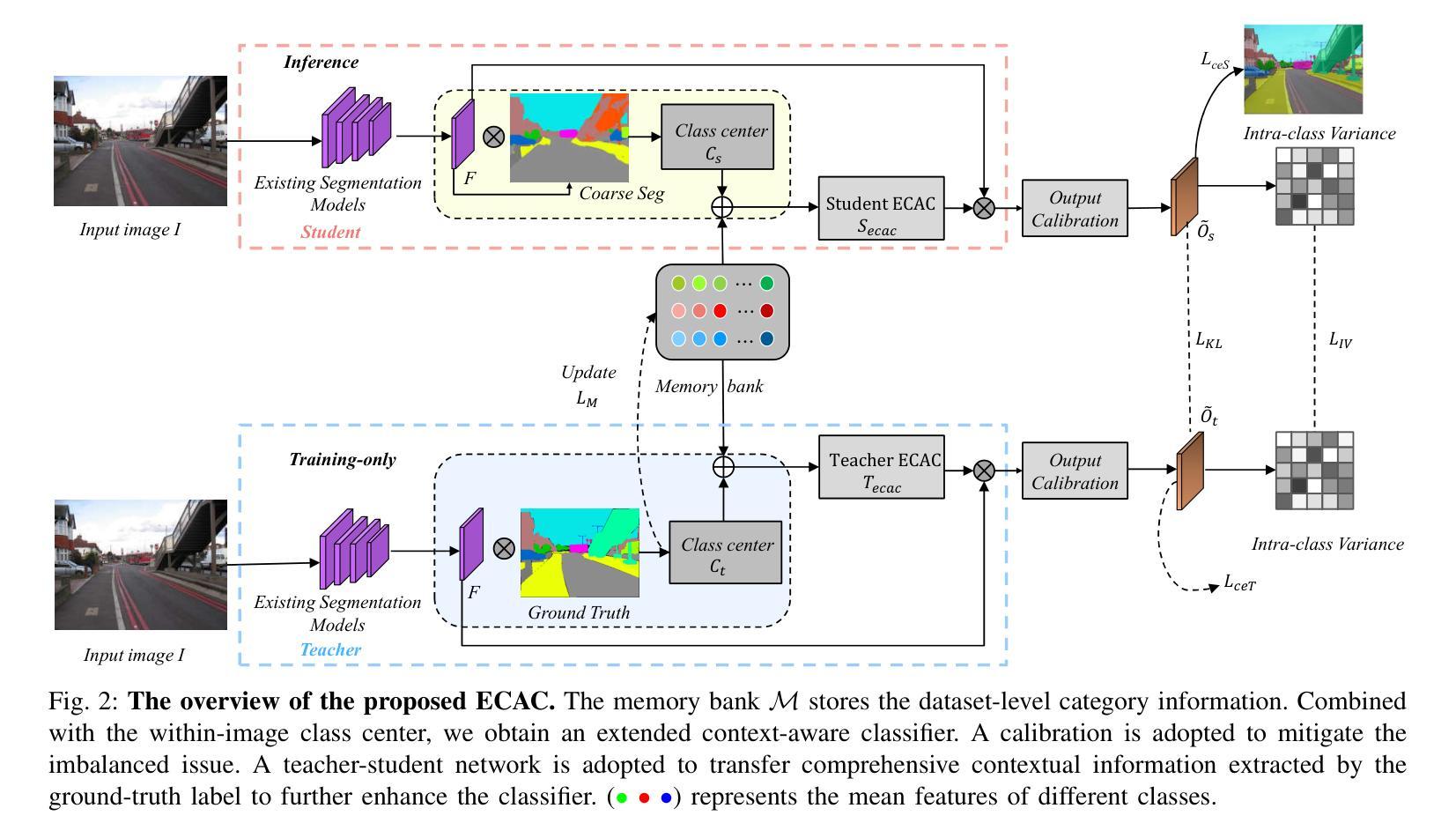 在本文中,为了解决现有语义分割方法的局限性问题,提出了一个名为扩展上下文感知分类器(ECAC)的新方法。传统方法通常使用固定参数的分类器对像素进行分类,忽视了每幅图像的类分布差异以及数据集级别的类不平衡问题。而ECAC利用全局和局部上下文信息动态调整分类器,借助内存库学习每个类的数据集级别上下文信息,并结合当前图像的类特定上下文信息来提高分类器的精度。此外,还采用了教师-学生网络范式,动态调整真实上下文信息并向学生网络传递知识。实验证明,ECAC在多个数据集上取得了最先进的性能。