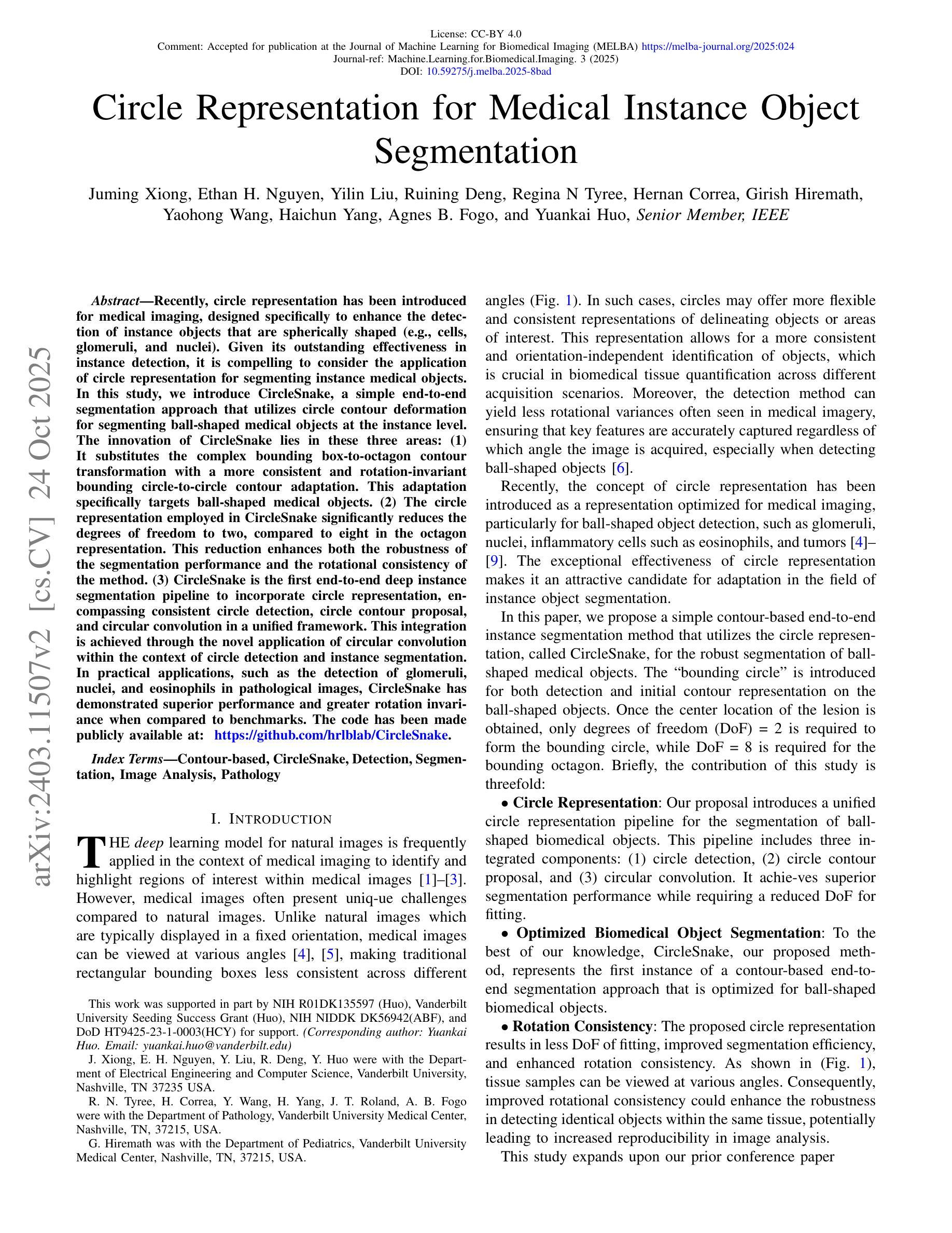 本文介绍了CircleSnake方法,这是一种针对球形医疗对象实例级分割的端到端分割方法。它采用圆形轮廓变形技术,通过引入圆形表示,简化了复杂的边界框到八边形轮廓转换,并显著提高了分割性能和旋转一致性。CircleSnake是首个将圆形表示、圆形轮廓提议和圆形卷积整合在统一框架中的深度实例分割管道。在肾小球、细胞核和病理图像中的嗜酸性粒细胞检测等实际应用中,与基准测试相比,CircleSnake表现出了卓越的性能和更高的旋转不变性。