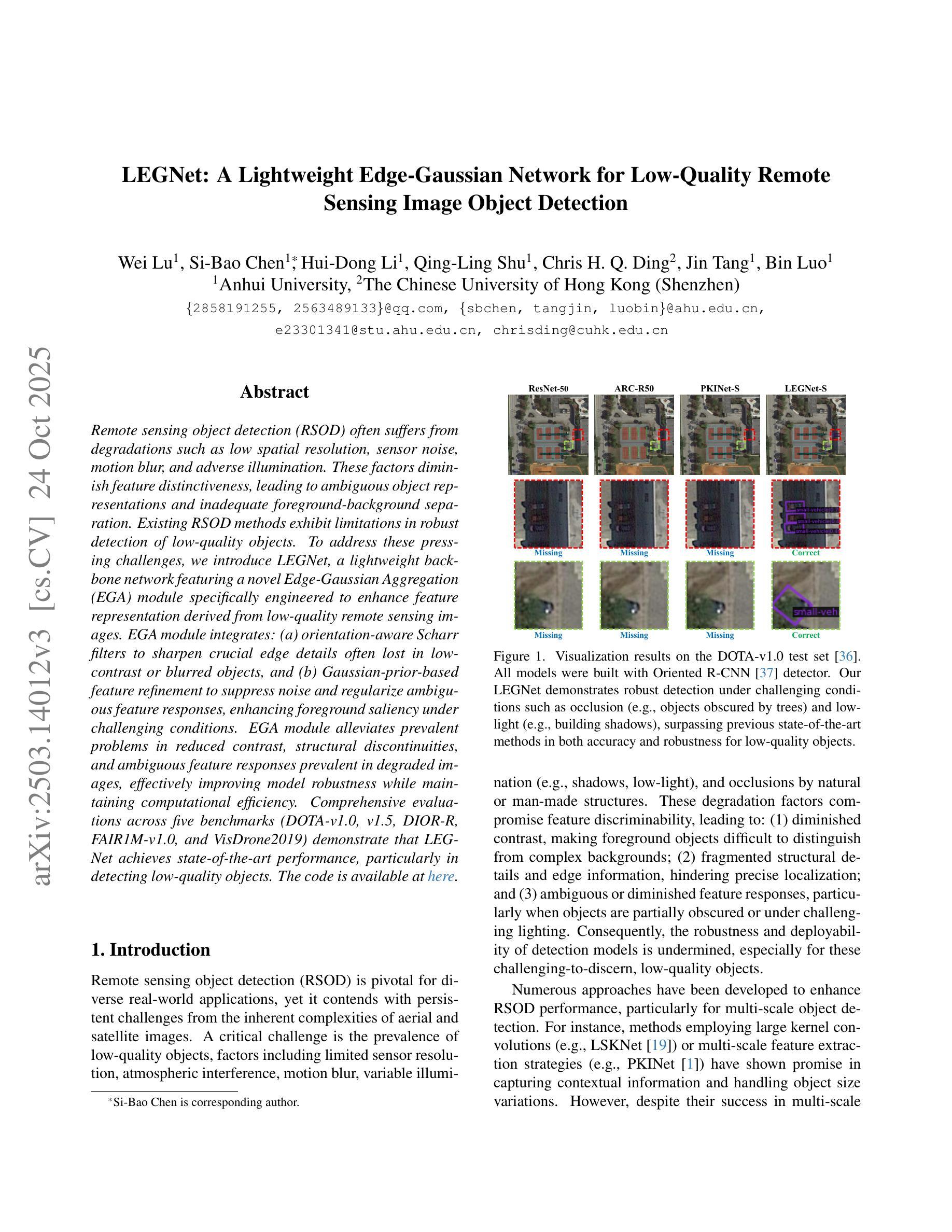 遥感目标检测(RSOD)经常受到空间分辨率低、传感器噪声、运动模糊和恶劣照明等问题的困扰。这些因素降低了特征的区分度,导致目标表示不明确,前景与背景分离不足。现有的RSOD方法在检测低质量目标时表现出局限性。为了应对这些紧迫挑战,我们引入了LEGNet,这是一个具有新型边缘高斯聚合(EGA)模块的轻量级主干网络,专门设计用于增强从低质量遥感图像中派生的特征表示。EGA模块集成了:(a)定向感知的Scharr滤波器,用于锐化低对比度或模糊目标中经常丢失的关键边缘细节;(b)基于高斯先验的特征细化,用于抑制噪声并规范模糊的特征响应,从而在具有挑战性的条件下增强前景显著性。EGA模块减轻了退化图像中常见的对比度降低、结构不连续和特征响应模糊的问题,在保持计算效率的同时有效提高了模型的鲁棒性。在五个基准测试(DOTA-v1.0、v1.5、DIOR-R、FAIR1M-v1.0和VisDrone2019)上的综合评估表明,LEGNet实现了最先进的性能,特别是在检测低质量目标方面。代码可在https://github.com/AeroVILab-AHU/LEGNet找到。