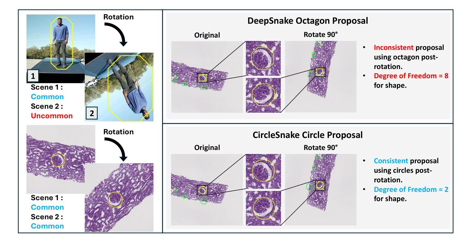 最近,圆形表示法被引入到医学成像中,专门用于增强球形实例对象(如细胞、肾小球和细胞核)的检测。鉴于其在实例检测中的出色效果,考虑将圆形表示法应用于医学实例对象的分割是非常有吸引力的。在本研究中,我们引入了CircleSnake,这是一种简单的端到端分割方法,利用圆形轮廓变形来对球形医学对象进行实例级别的分割。CircleSnake的创新之处在于以下三个方面:(1)它用更一致且旋转不变的圆形轮廓替代了复杂的边界框到八边形轮廓的转换。这种适应性专门针对球形医学对象。(2)CircleSnake中使用的圆形表示法将自由度降低到两个,与八边形表示的八个自由度相比。这种降低增强了分割性能的鲁棒性和方法的旋转一致性。(3)CircleSnake是第一个采用圆形表示的端到端深度实例分割管道,它包含一致的圆形检测、圆形轮廓建议和圆形卷积的统一框架。这种集成是通过在圆形检测和实例分割的上下文中新颖地应用圆形图卷积来实现的。在实际应用中,如在病理图像中检测肾小球、细胞核和嗜酸性粒细胞等,与基准测试相比,CircleSnake表现出优越的性能和更大的旋转不变性。代码已公开发布在:[https://github.com/hrlblab/CircleSnake。]