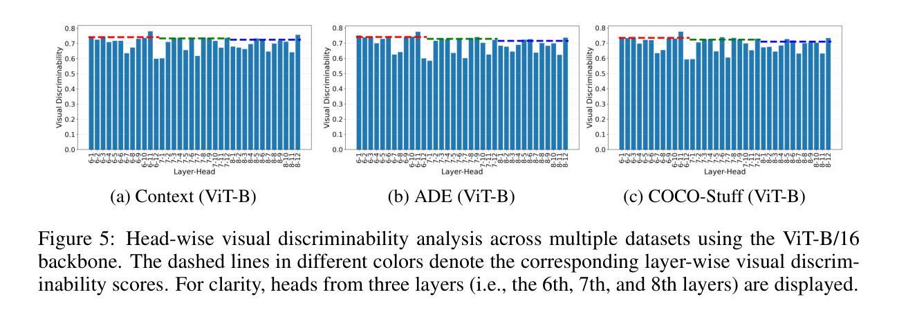 - 基于上述发现,本文提出三种互补技术:语义空间重新加权、选择性头部增强和异常令牌替换,以恢复视觉辨别能力并提高分割性能。