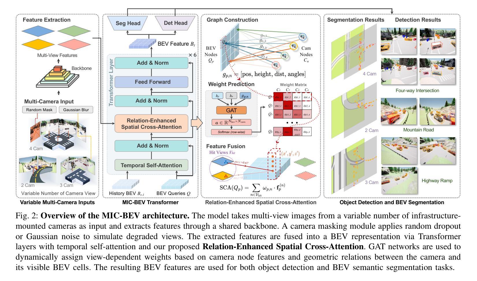 基于基础设施的感知在智能交通系统中起着至关重要的作用,它提供全局态势感知并促进协同自主。然而,由于多视角基础设施设置、不同摄像头配置、视觉输入退化以及各种道路布局等挑战,现有的基于摄像头的检测模型在这种情况下通常表现不佳。我们引入了MIC-BEV,这是一个基于Transformer的鸟瞰图(BEV)感知框架,用于基于基础设施的多摄像头3D对象检测。MIC-BEV灵活支持具有不同固有和外在参数的多个摄像头,并在传感器退化的情况下表现出强大的稳健性。MIC-BEV中提出的图增强融合模块通过利用摄像头和BEV单元之间的几何关系以及潜在视觉线索,将多视角图像特征集成到BEV空间中。为了支持和评估,我们引入了M2I,这是一个用于基础设施对象检测的合成数据集,具有各种摄像头配置、道路布局和环境条件。在M2I和真实世界数据集RoScenes上的大量实验表明,MIC-BEV在3D对象检测方面达到了最新技术水平。它在极端天气和传感器退化等挑战条件下仍然保持稳健。这些结果突出了MIC-BEV在现实世界部署的潜力。数据集和源代码可在:https://github.com/HandsomeYun/MIC-BEV 获得。