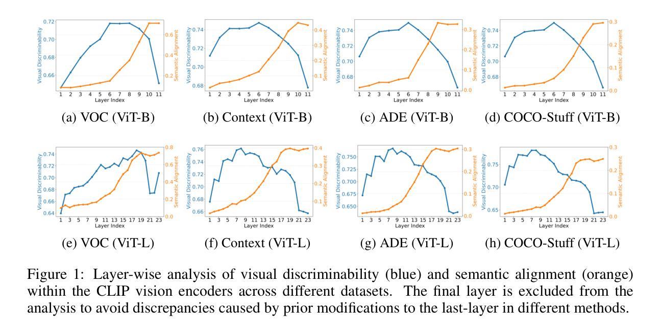 将CLIP模型扩展到语义分割仍然是一个挑战,因为图像级的预训练目标与密集预测所需的像素级视觉理解之间存在不匹配。尽管先前的努力通过重新组织最后一层和特征取得了令人鼓舞的结果,但它们往往继承了前层的全局对齐偏见,导致分割性能不佳。在这项工作中,我们提出了LHT-CLIP,这是一种新的无训练框架,系统地利用CLIP在不同层次(层、头和令牌)的视觉辨别力。通过综合分析,我们揭示了三个关键见解:(i)最后几层主要通过加强图像文本对齐来牺牲视觉辨别力(例如ViT-B/16的最后3层和ViT-L/14的8层),部分原因是由于异常令牌的出现;(ii)一小部分注意力头(例如ViT-B/16中的10个注意力头)在数据集上始终表现出强大的视觉辨别力;(iii)异常令牌与正常令牌相比,显示出稀疏且一致的激活模式。基于这些发现,我们提出了三种互补技术:语义空间重新加权、选择性头部增强和异常令牌替换,以有效地恢复视觉辨别力,提高分割性能,而无需任何额外的训练、辅助预训练网络或广泛的超参数调整。在8个常见的语义分割基准测试上的实验表明,LHT-CLIP在多种场景中都达到了最先进的性能,凸显了其在现实世界部署中的有效性和实用性。