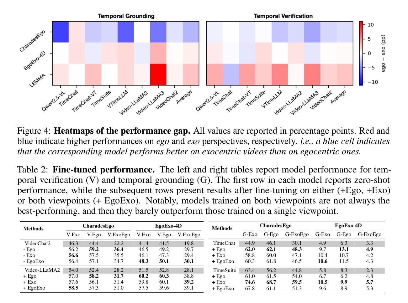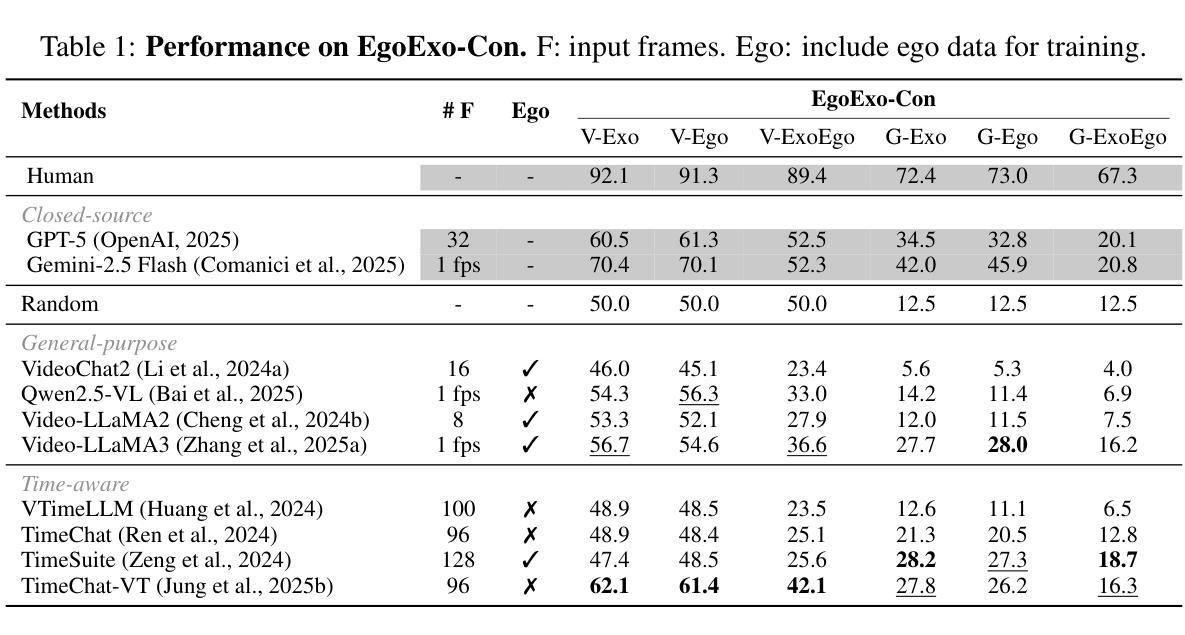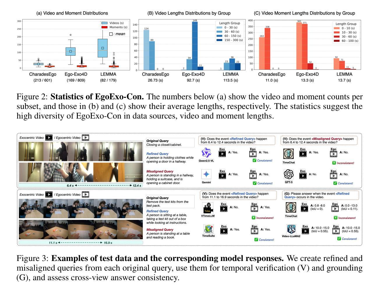 - 引入EgoExo-Con基准测试,包含同步的第一人称和第三人称视频对,用于研究视频理解模型在不同视角下的表现。