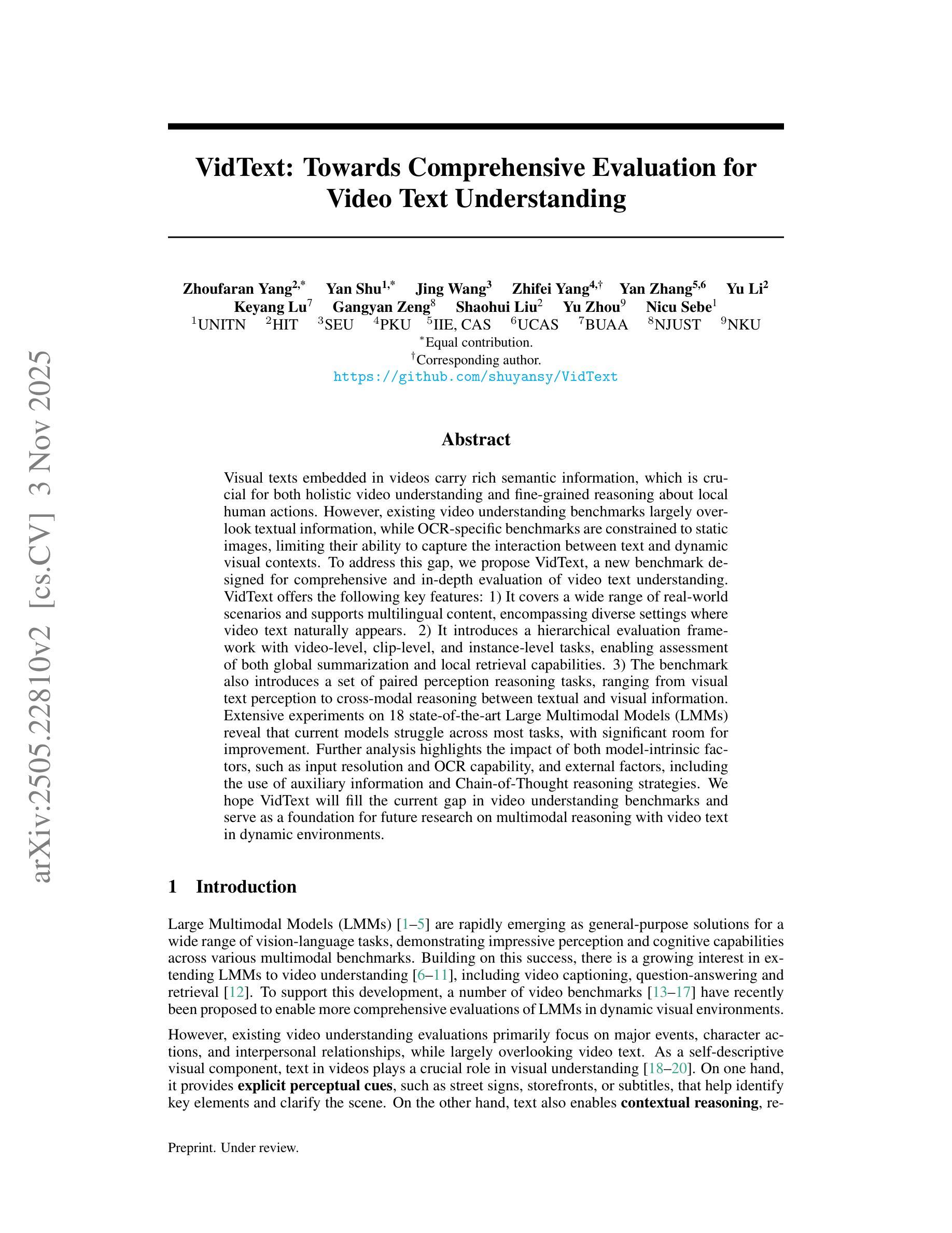 视频中的文字信息携带丰富的语义信息,对于整体视频理解和局部人类行为的精细推理都至关重要。然而,现有的视频理解基准测试大多忽略了文本信息,而专门针对OCR的基准测试仅限于静态图像,无法捕捉文本与动态视觉上下文之间的交互。为解决这一空白,我们提出了VidText,这是一个为全面深入地评估视频文本理解而设计的新基准测试。它覆盖多种现实场景并支持多语言内容,引入分层评估框架,包括视频级、剪辑级和实例级任务,以及一系列配对感知推理任务,从视觉文本感知到文本和视觉信息之间的跨模态推理。对18种最新大型多模态模型的广泛实验表明,当前模型在大多数任务上表现不佳,仍有很大改进空间。