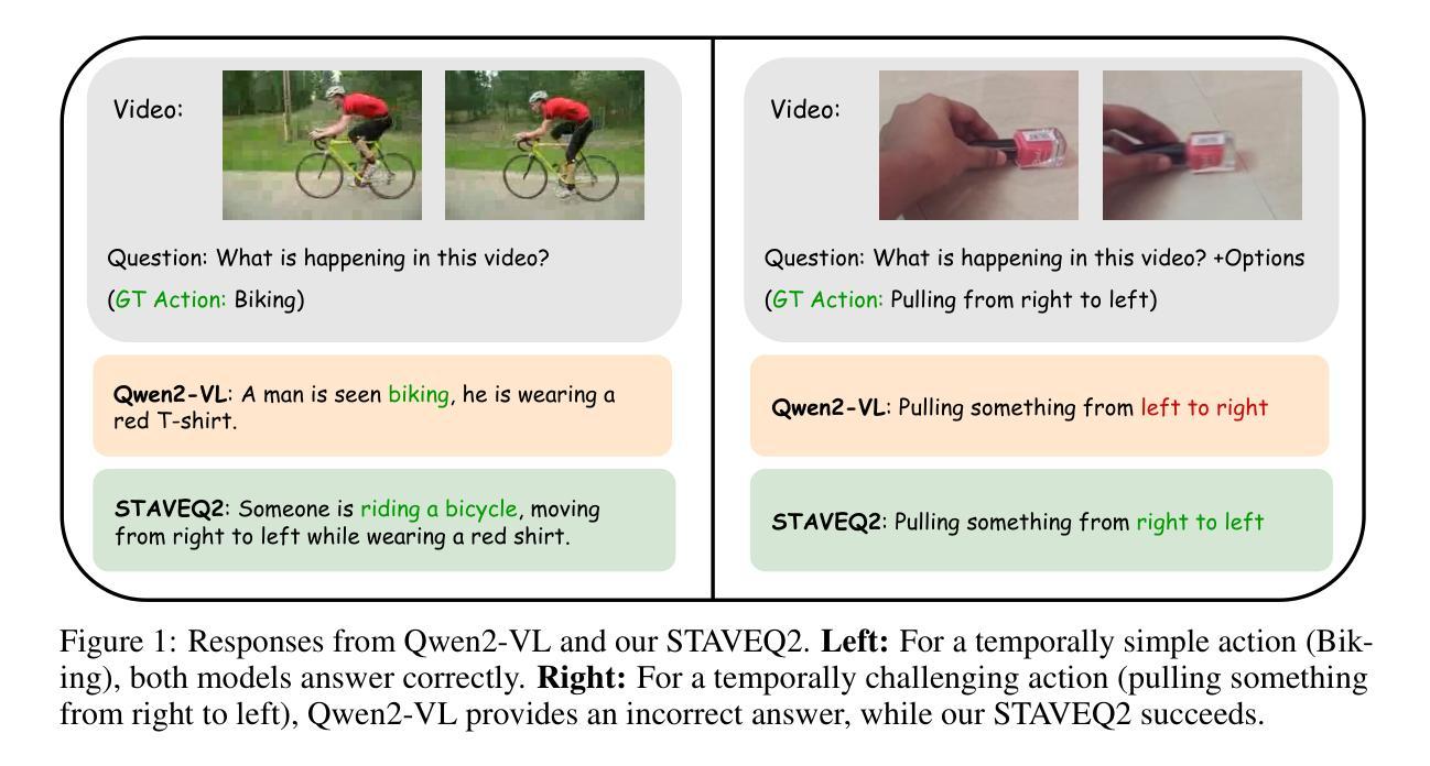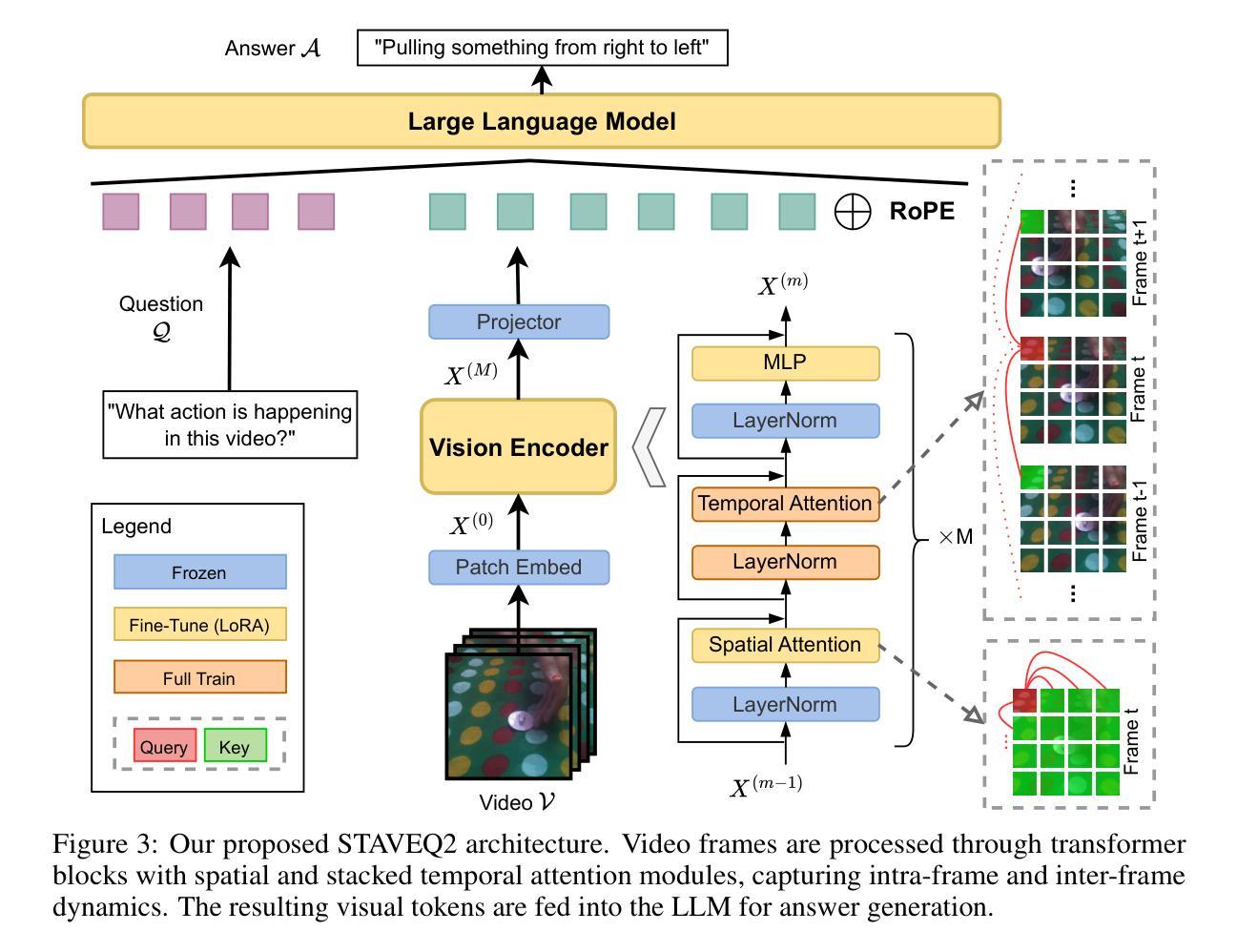 尽管多模态大型语言模型(MLLM)取得了重大进展,但理解视频中的复杂时间动态仍然是一个主要挑战。我们的实验表明,当前的视频大型语言模型(Video-LLM)架构在时间理解方面存在关键局限,难以应对要求详细了解动作序列和时间进展的任务。在这项工作中,我们提出了一种Video-LLM架构,该架构直接在视觉编码器内引入堆叠的时间注意力模块。这种设计在视觉编码器中融入了时间注意力,使模型能够更好地捕捉动作的进展以及帧之间的关系,然后将视觉令牌传递给LLM。我们的结果表明,这种方法在视频问答任务中显著提高了时间推理能力,特别是在动作识别方面超过了现有模型。我们在包括VITATECS、MVBench和Video-MME在内的基准测试中提高了高达+5.5%。通过增强视觉编码器的时间结构,我们解决了视频理解方面的一个关键空白领域。项目页面和代码可在:https://alirasekh.github.io/STAVEQ2/找到。