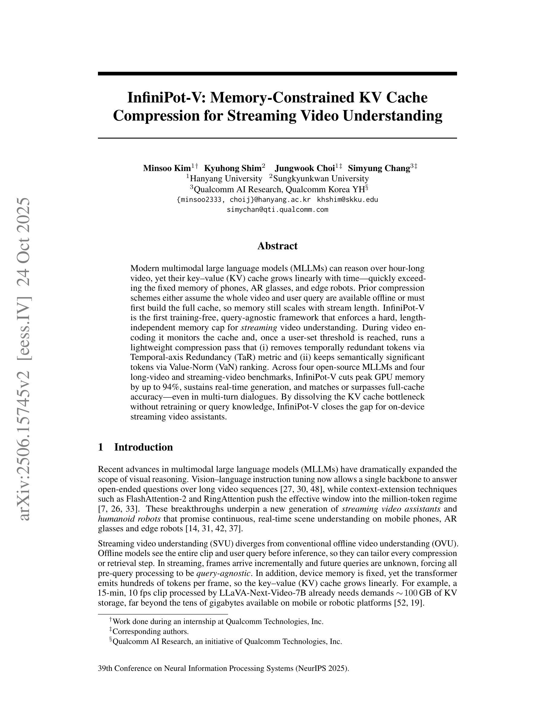现代的多模态大型语言模型(MLLMs)能够对长达数小时的视频进行推理,然而其键值(KV)缓存会随时间线性增长,很快超过手机、AR眼镜和边缘机器人的固定内存。之前的压缩方案要么假设整个视频和用户查询都可以离线使用,要么必须先建立完整的缓存,因此内存仍然会随着流长度的增加而扩展。InfiniPot-V是第一个无需训练、与查询无关的框架,它为流式视频理解强制执行一个硬性的、与长度无关的内存上限。在视频编码过程中,它会监控缓存,一旦达到用户设定的阈值,就会运行一个轻量级的压缩过程,该过程(i)通过时间轴冗余(TaR)指标删除时间上的冗余标记,(ii)通过值范数(VaN)排名保留语义上重要的标记。在四个开源的MLLM和四个长视频及流式视频基准测试中,InfiniPot-V将峰值GPU内存减少了高达94%,保持实时生成,并在多轮对话中匹配或超越了全缓存的准确率。通过消除无需重新训练或查询知识的KV缓存瓶颈,InfiniPot-V缩小了设备流媒体视频助理之间的差距。