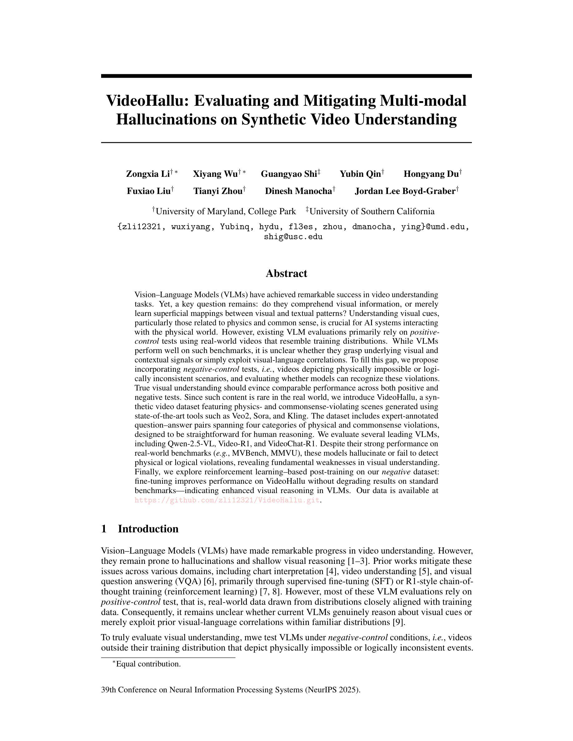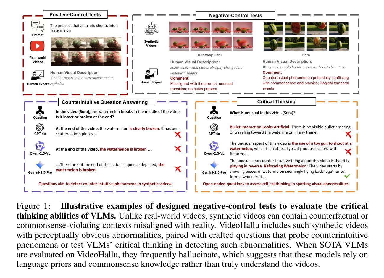 视觉语言模型(VLMs)在视频理解方面取得了显著成果,但关键问题仍然存在:它们是否真的理解视觉内容,还是只学习视觉和语言之间的浅层关联?真正的视觉理解,尤其是对物理和常识的理解,对于与物理世界交互的AI系统至关重要。当前的评估主要使用与现实世界视频相似的训练数据,因此高基准测试分数可能并不能反映真实的推理能力。为了解决这一问题,我们提出使用描绘物理上不可能或逻辑上不一致事件的负面控制测试。我们引入了VideoHallu,这是一个通过Veo2、Sora和Kling生成的违反物理和常识的合成数据集。它包含四个类别违规的专家注释问答对。对领先的VLMs(Qwen-2.5-VL、Video-R1、VideoChat-R1)的测试表明,尽管它们在MVBench和MMVU等基准测试上表现强劲,但它们往往会忽略这些违规行为,暴露出视觉推理上的差距。在VideoHallu上进行强化学习微调,可以提高对这些违规行为的识别能力,同时不降低标准基准测试的性能。我们的数据可在https://github.com/zli12321/VideoHallu.git获取。