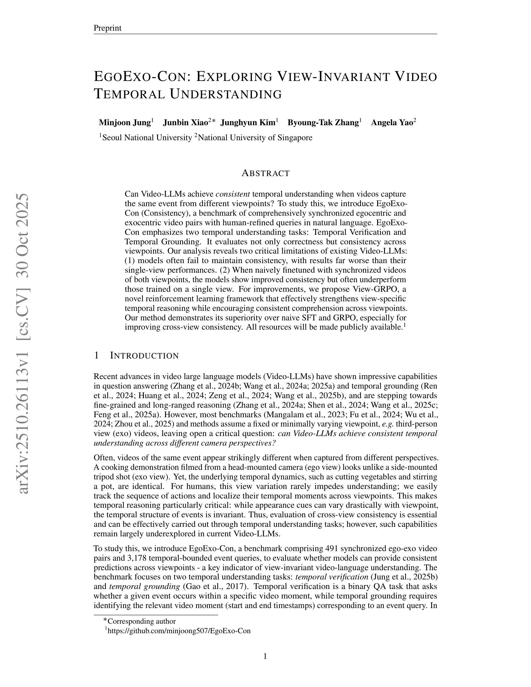 当视频从不同视角捕捉同一事件时,视频大型语言模型(Video-LLMs)能否实现一致的时间理解?为了研究这个问题,我们引入了EgoExo-Con(一致性)基准测试,这是一个包含全面同步的第一人称和第三人称视频对以及人类用自然语言精细查询的基准测试。EgoExo-Con强调两种时间理解任务:时间验证和时间基础。它不仅评估正确性,还评估不同视角之间的一致性。我们的分析揭示了现有Video-LLMs的两个关键局限性:(1)模型往往不能保持一致性,其多视角的结果比单一视角的结果要差得多。(2)当用两个视角的同步视频进行简单微调时,模型的一致性有所提高,但在单一视角上的训练往往表现较差。为了改进这一点,我们提出了View-GRPO,这是一种新的强化学习框架,它能有效地加强特定视角的时间推理,同时鼓励不同视角之间的一致理解。我们的方法在公开测试集上优于简单的微调方法和GRPO方法,特别是在提高跨视角一致性方面表现优越。所有资源都将公开发布。