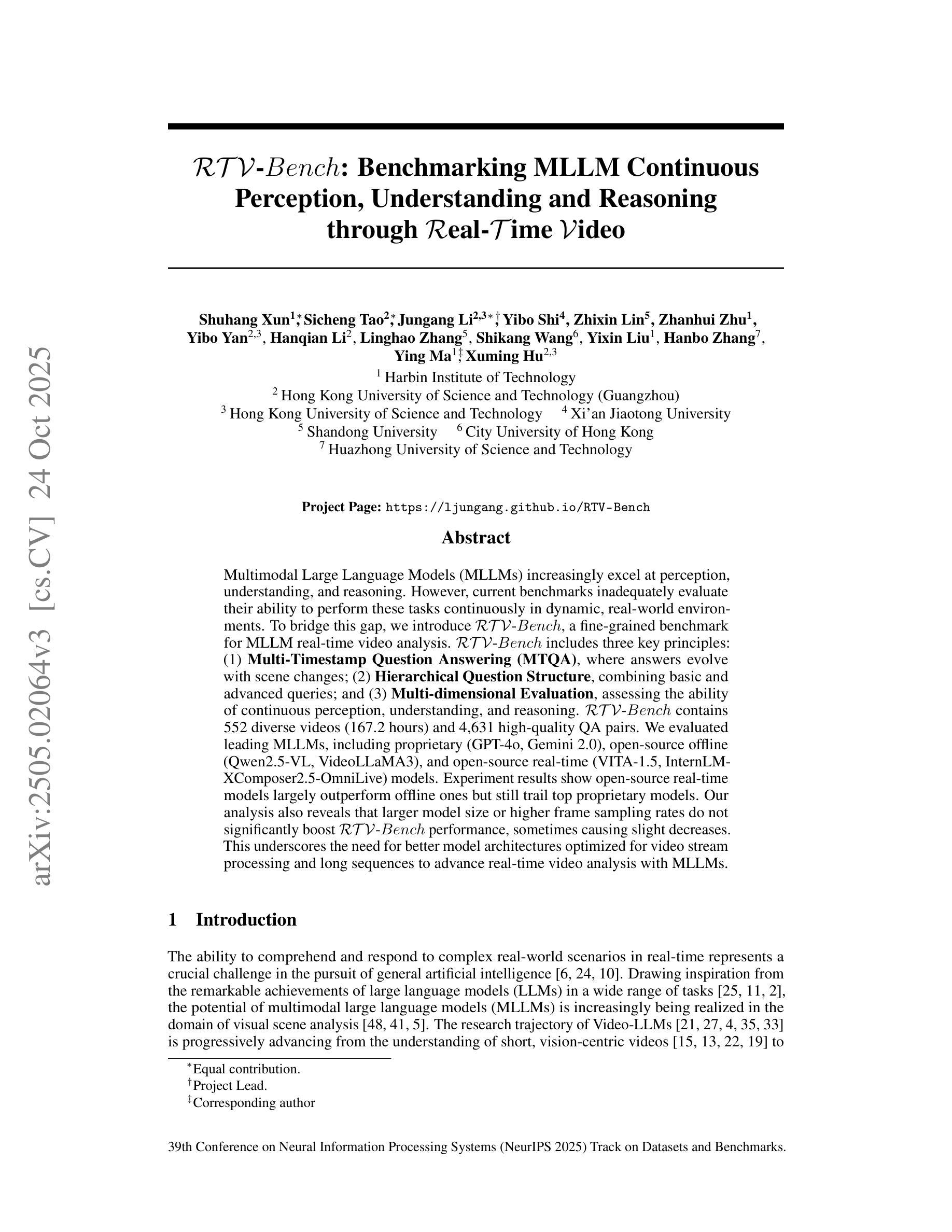 多模态大型语言模型(MLLMs)在感知、理解和推理方面越来越出色。然而,当前的基准测试未能充分评估它们在动态、现实环境中连续执行这些任务的能力。为了弥补这一差距,我们推出了RTV-Bench,这是针对MLLM实时视频分析的高精度基准测试。RTV-Bench采用三个关键原则:(1)多时间戳问答(MTQA),答案随场景变化而演变;(2)分层问题结构,结合基本和高级查询;(3)多维评估,评估连续感知、理解和推理的能力。RTV-Bench包含552个多样化视频(167.2小时)和4631组高质量问答对。我们评估了领先的多模态大型语言模型,包括专有模型(GPT-4o、Gemini 2.0)、开源离线模型(Qwen2.5-VL、VideoLLaMA3)和开源实时模型(VITA-1.5、InternLM-XComposer2.5-OmniLive)。实验结果表明,开源实时模型大多优于离线模型,但仍落后于顶级专有模型。我们的分析还表明,更大的模型规模或更高的帧采样率并不会显著提高RTV-Bench的性能,有时甚至会导致轻微下降。这强调了在视频流处理和长序列优化方面需要更好的模型架构,以推动使用MLLMs的实时视频分析的发展。我们的基准测试工具包可在以下网址获取:https://github.com/LJungang/RTV-Bench 。