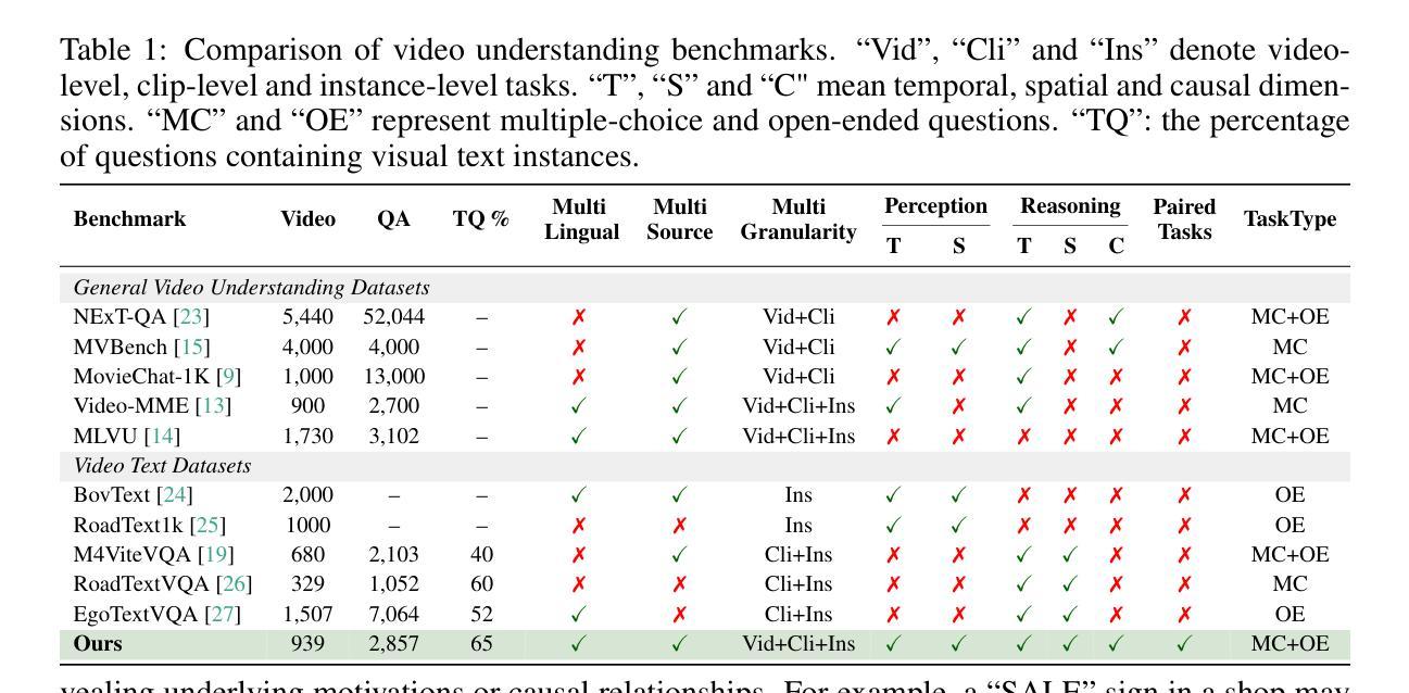 - 现有视频理解基准测试忽略了文本信息,OCR基准测试受限于静态图像。